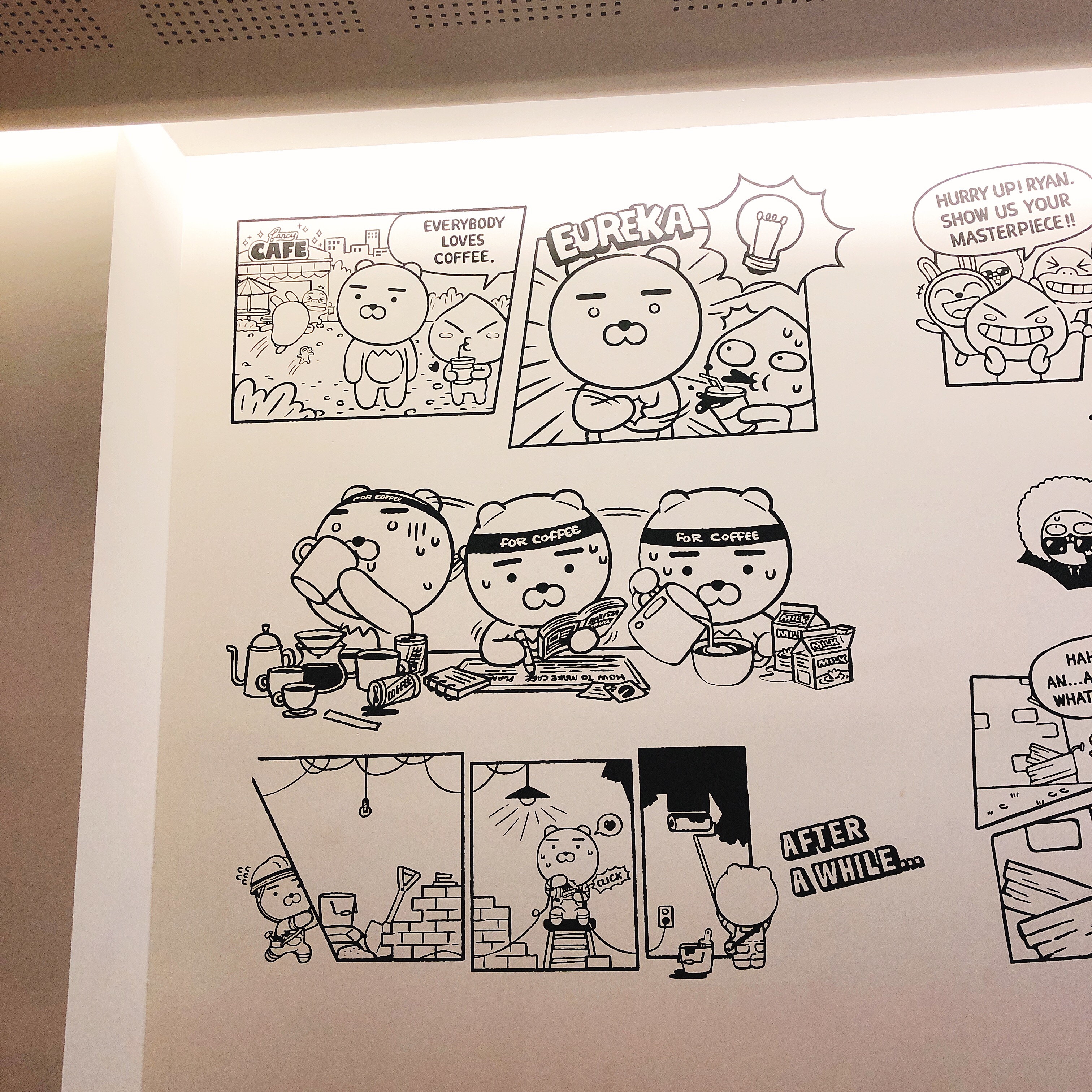 어느날 카카오 프렌즈들이 커피를 마시러 갔습니다. 사람들이 커피를 좋아한다는 사실을 안 라이언은 유레카를 외칩니다. 카페를 차리기로 결심한 것이죠. 그 후 커피에 대해 공부를 하기 시작합니다. 그리고 직접 벽돌을 쌓아서 카페를 짓고 있었습니다.