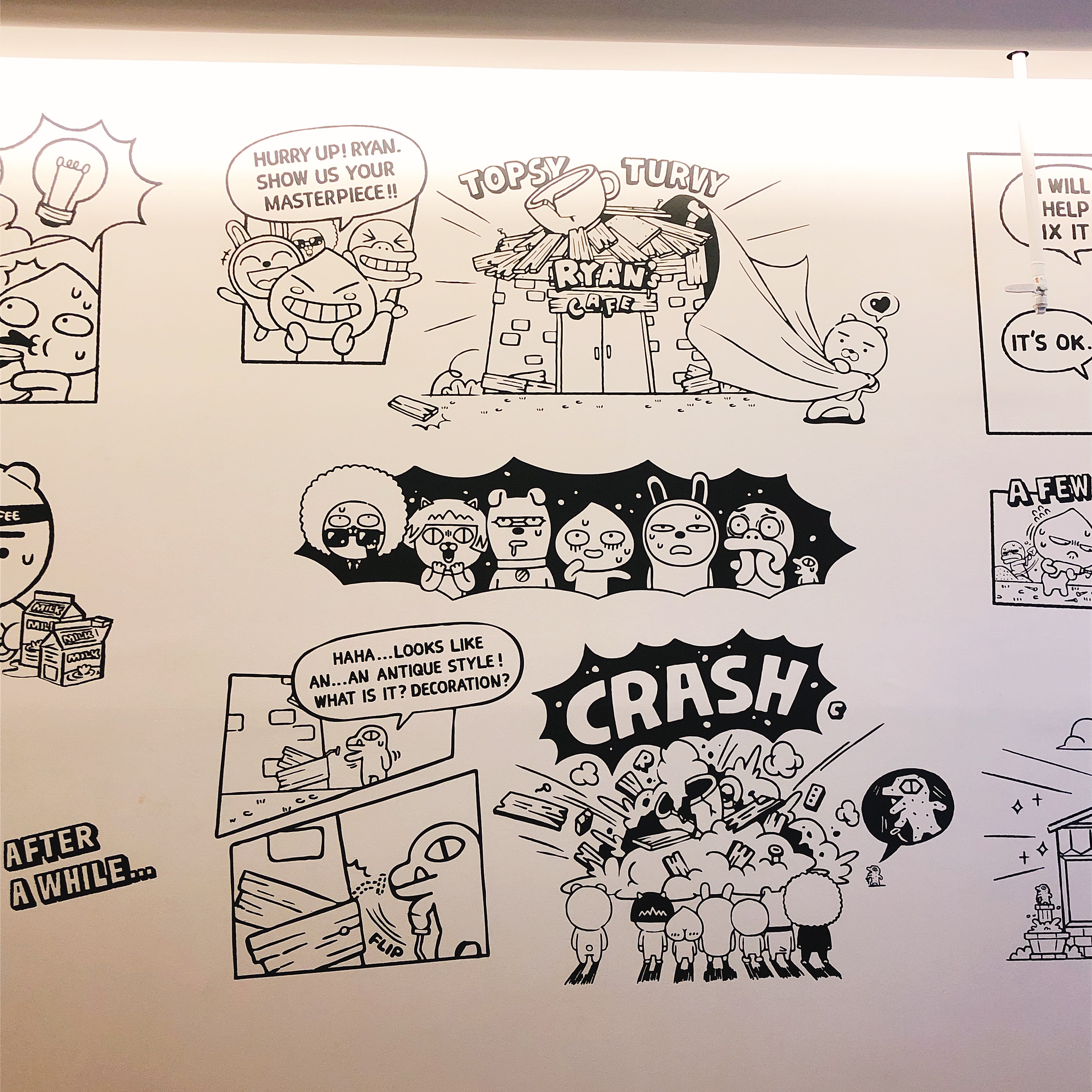 그렇게 라이언은 카페를 차리고 친구들을 초대했습니다. 그런데 모양이 너무나 안타깝네요. 금방이라도 무너질것 처럼 생겼습니다. 친구들은 이런 모습에 매우 당황스러워 합니다. 이때 눈치없는 콘이 큰 사고를 칩니다. 벽으로 삐져나온 못을 데코라고 착각한 나머지 살짝 건드렸는데요. 그것 때문에 카페 건물이 무너져버립니다. (;;) 깜짝 놀란 콘은 그대로 굳어버렸습니다.