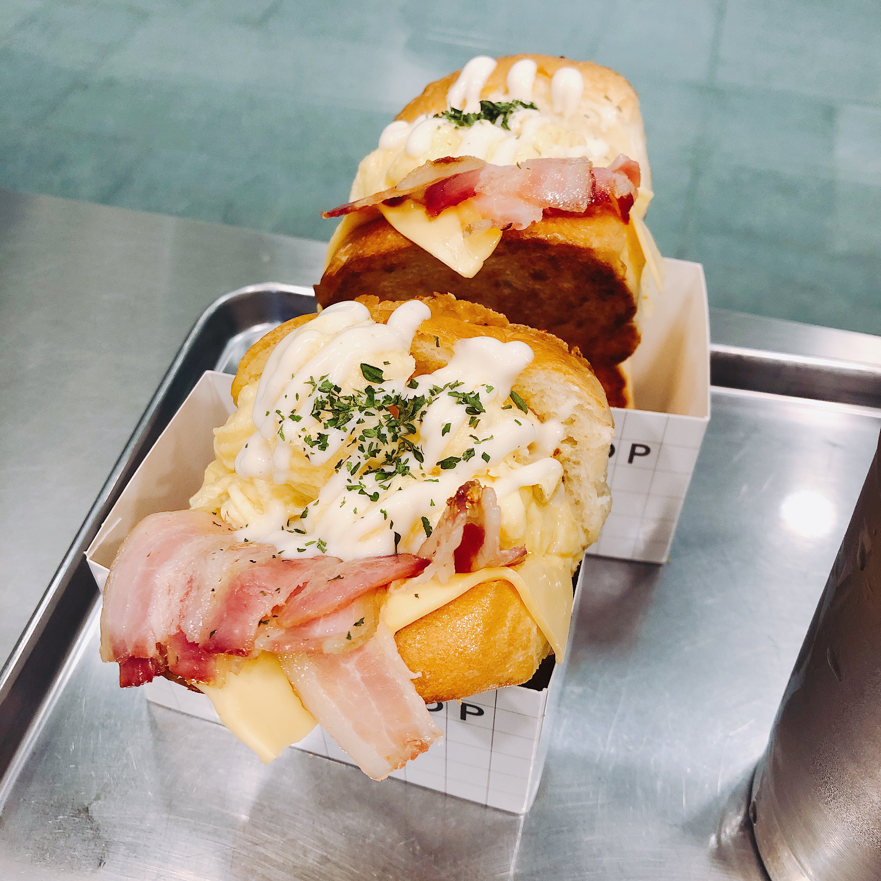 각각 "베이컨 더블 치즈", "갈릭 베이컨 치즈" 입니다. 평가하자면 일단 정말 맛있습니다. 계란이 듬뿍 든 토스트에 베이컨과 치즈가 올라간 그 맛, 거기에 마요네즈가 샤르르 뿌려져있는 바로 그 맛. 딱 상상하는 그 맛입니다. 근데 그게 너무나 맛있습니다. 특히 갈릭 브레드는 더더욱. 한국인이라면 남녀노소 누구나 좋아할 맛입니다.