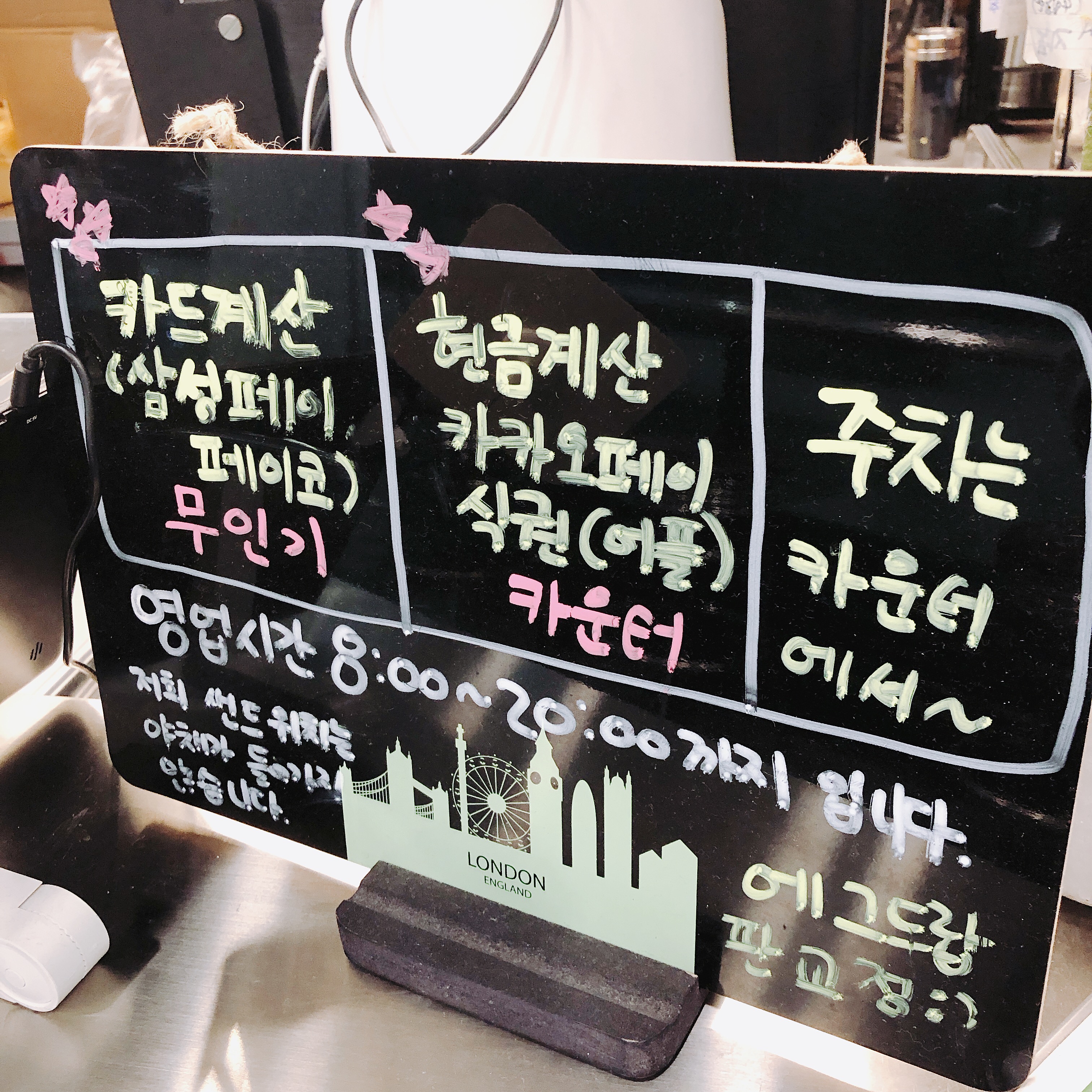 - 현금, 카카오페이는 카운터에서, 카드 및 페이코 결제는 무인 키오스크에서 가능하다.