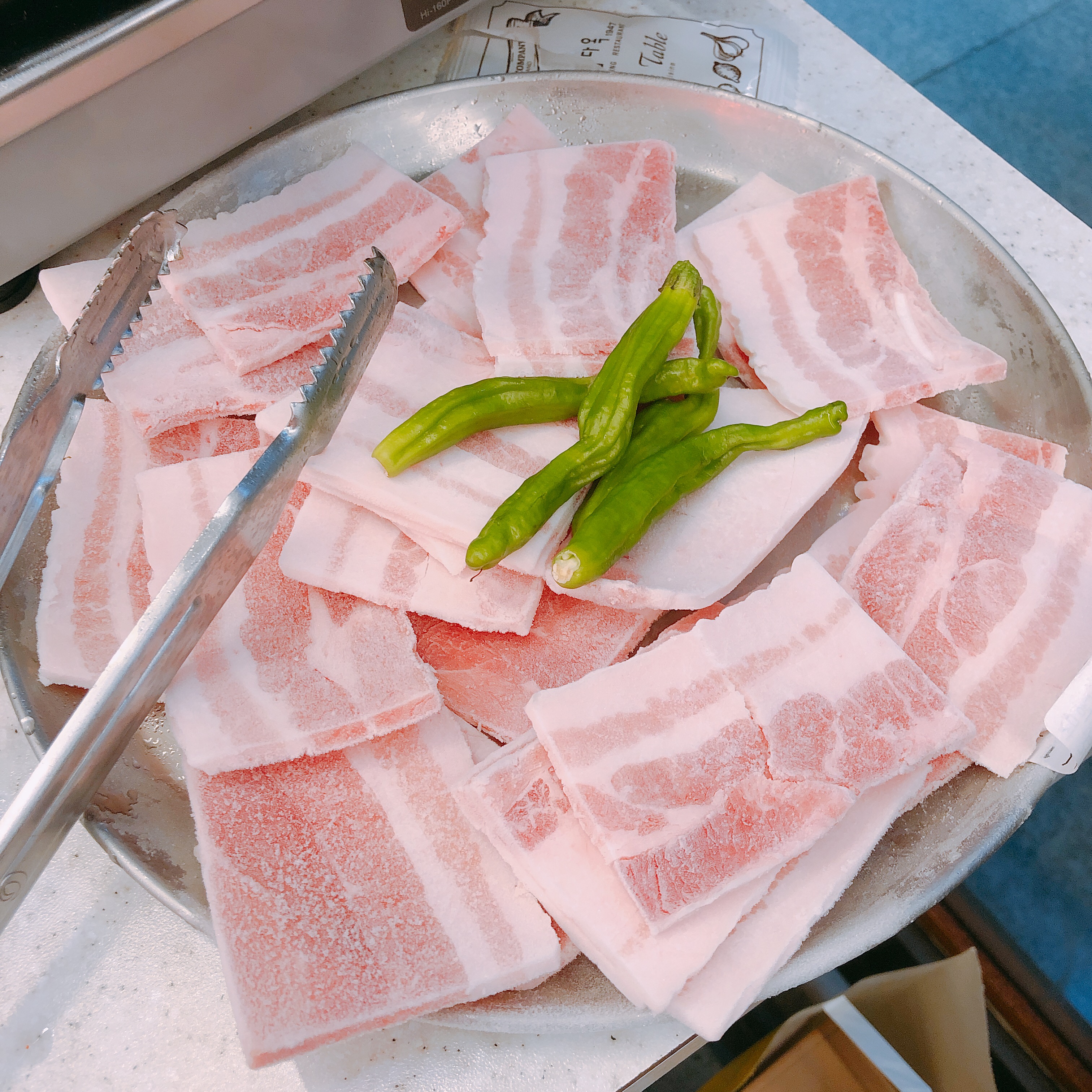 냉삼의 특징 중 하나를 꼽자면, 먹어도 먹어도 배가 안부르다는 것입니다. 그래서 추가주문을 할 수 밖에 없었습니다. 위처럼 고기와 그릇 자체가 차갑게 얼어있습니다. 누가봐도 냉동삼겹살임을 느끼게 해주는 퍼포먼스 같습니다. 다만 미나리 대신 꽈리고추가 곁들여 나왔습니다. 저것도 맛있습니다.
