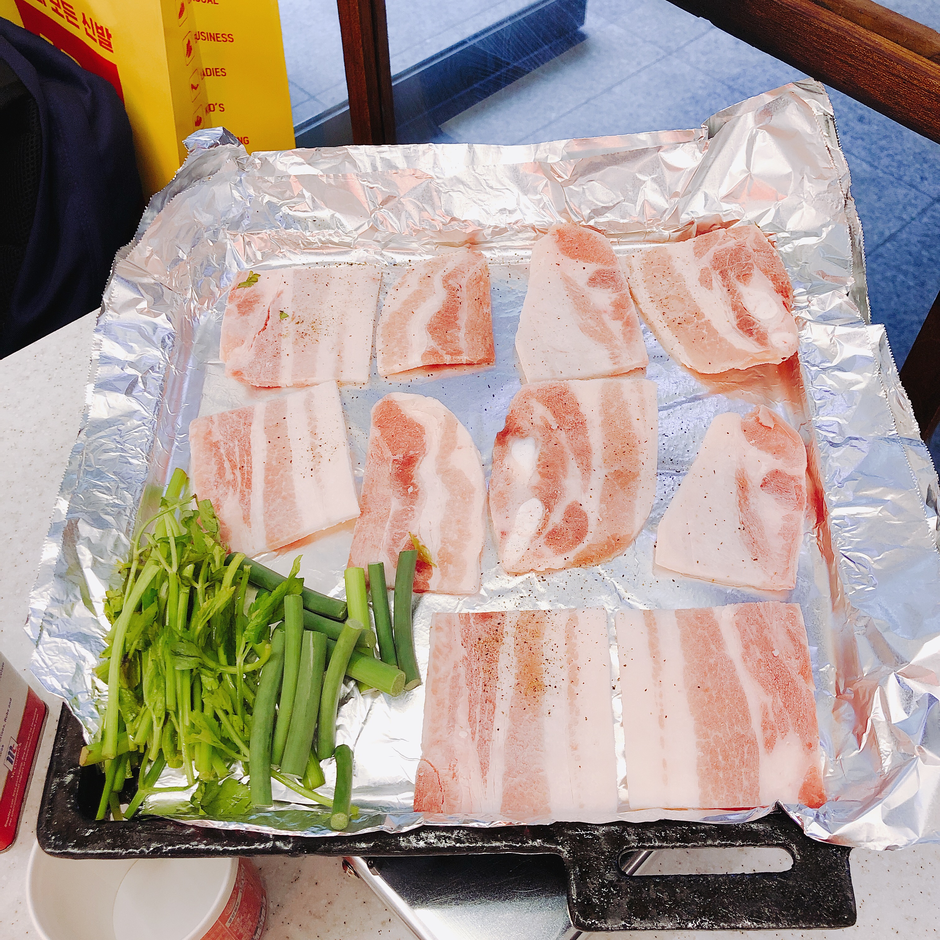 정말 정감가는 불판입니다. 호일이 깔여있습니다. 딱 봐도 건강엔 안좋아 보입니다만 건강 챙길거면 뭐하러 냉삼을 먹겠습니까? 저 어렸을때는 아버지를 따라 현장에서 작업 종료 후 석면에 삼겹살 구워먹기도 했는데요 뭐.