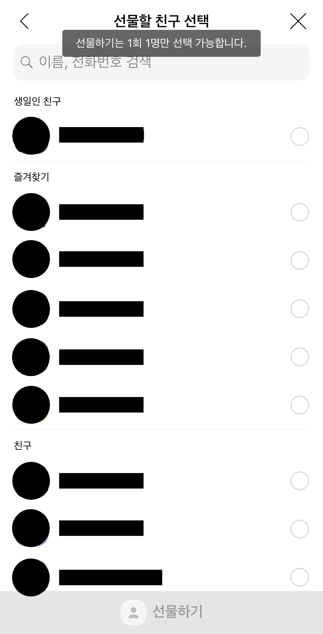 단순히 이모티콘 받을 사람을 고른 후 '선물하기'를 누르면 되겠습니다. 1회에 1명만 선택할 수 있다고 합니다.