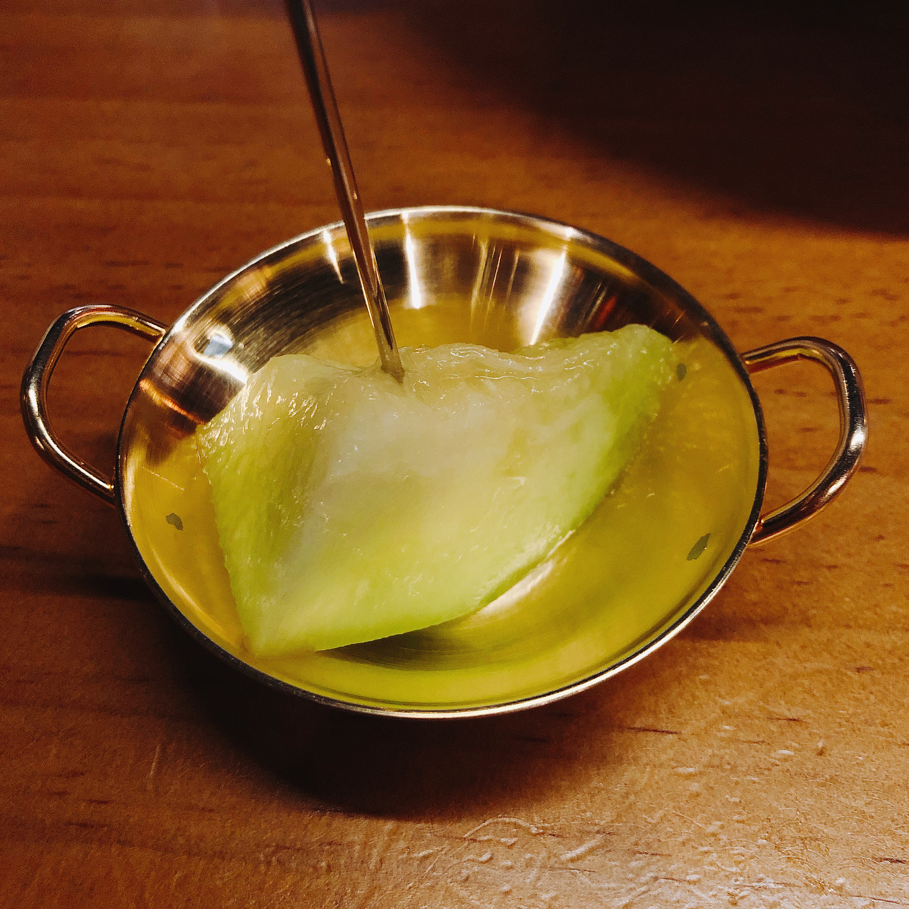 디저트로 과일이 제공됩니다. 정말 딱 한입 크기의 메론 한 조각입니다. 저 그릇또한 앙증맞습니다. 간장 종지 크기입니다. 너무 귀엽게 제공되어서 좋았습니다.