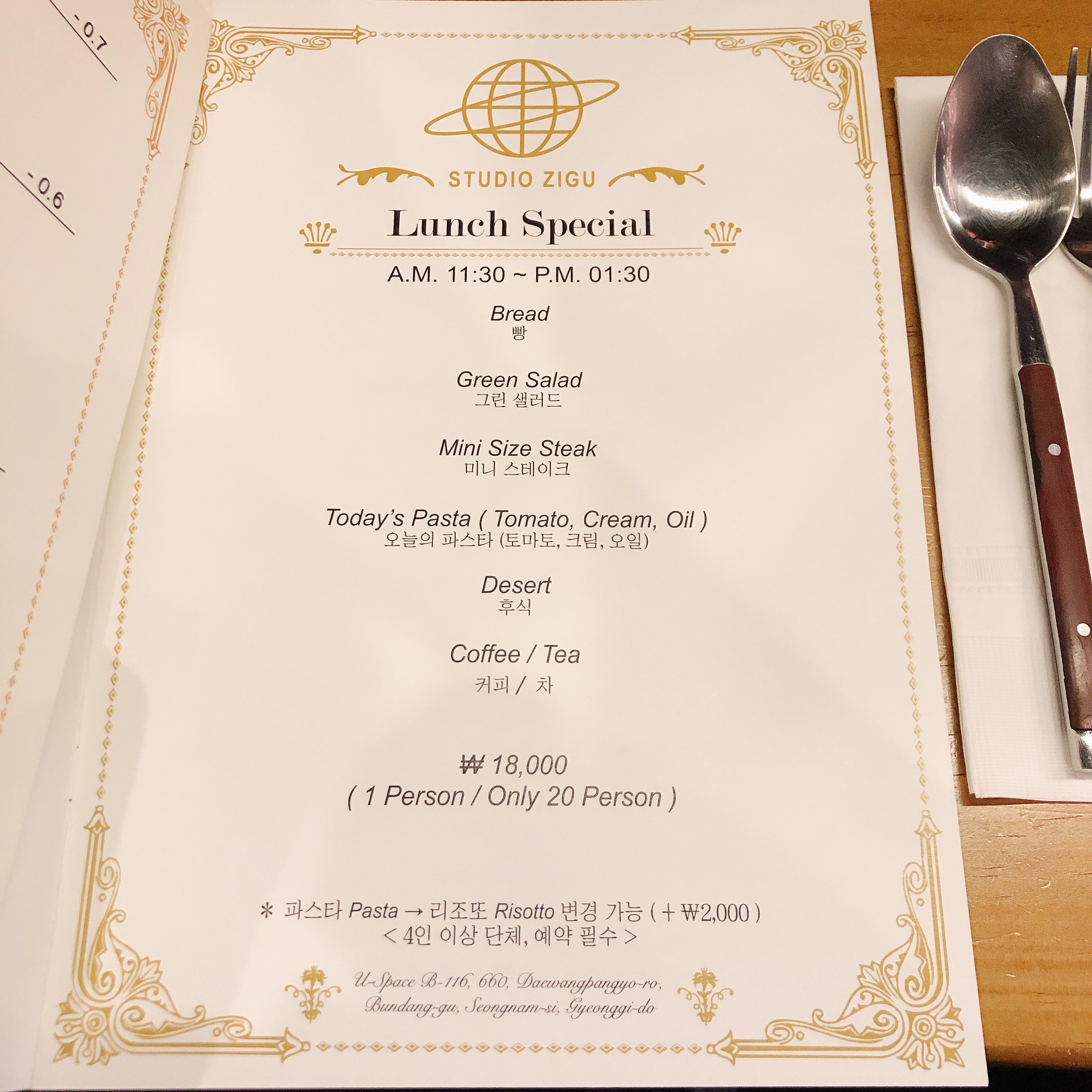 - 코스 메뉴만 제공. ₩18,000 단일 메뉴.