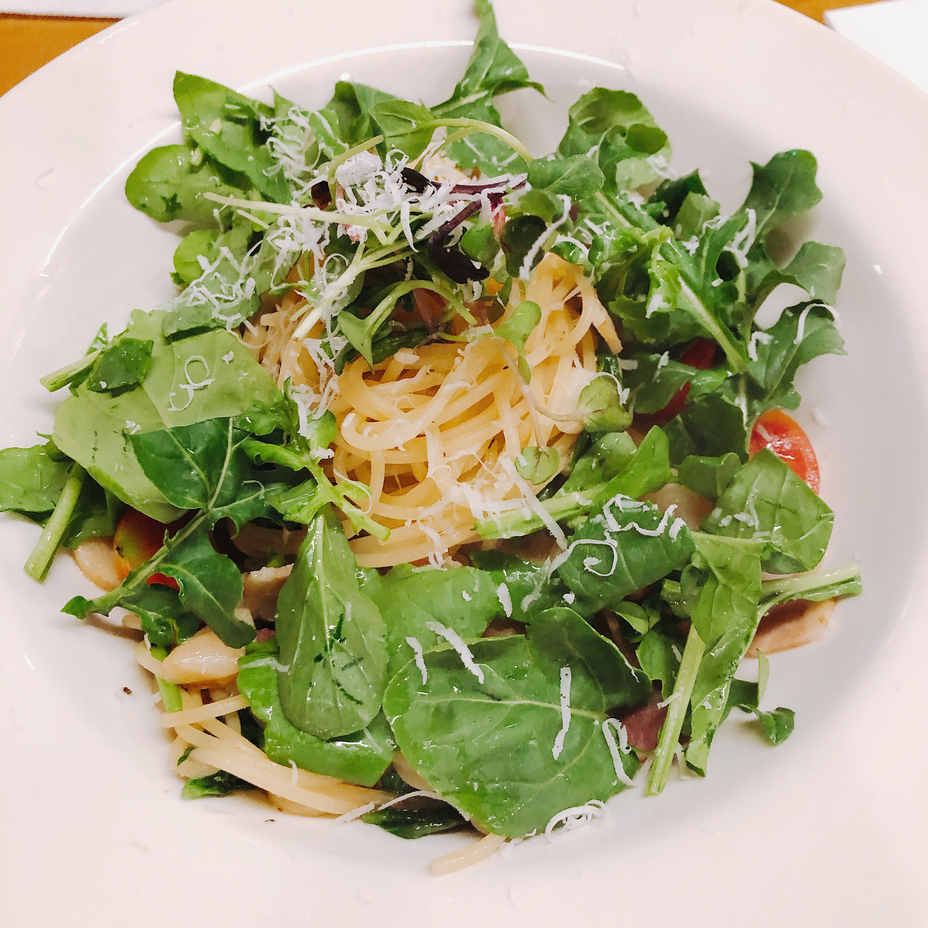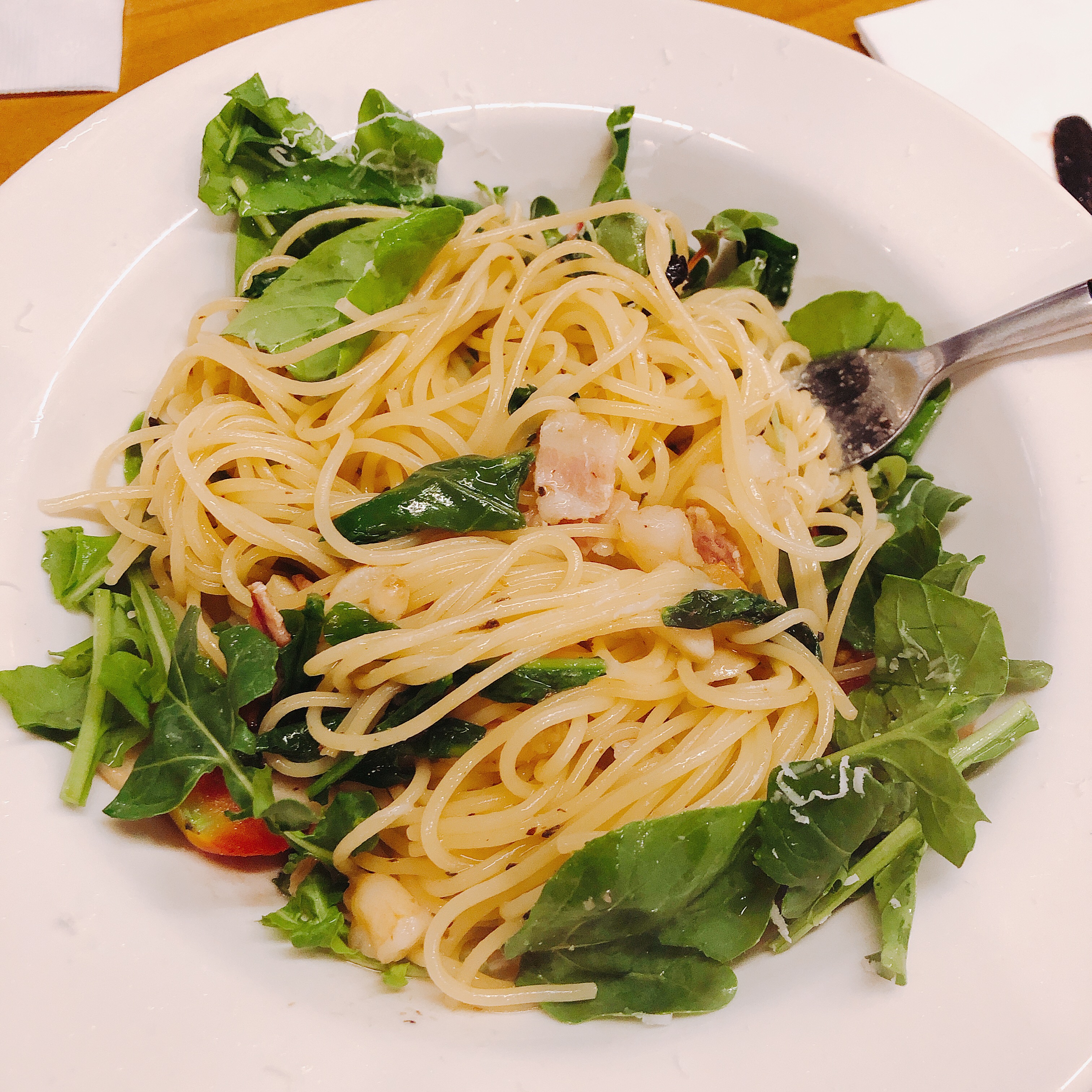 제가 주문한 시금치, 토마토, 베이컨, 새우 그리고 마늘이 듬뿍 들어간 오일 파스타입니다. 면의 익힘 정도가 정말 완벽했으며 재료들의 상태와 어우러짐도 훌륭했습니다. (물론 제가 양식에 대해 해박한것은 아닙니다만 그렇게 느껴졌네요.)