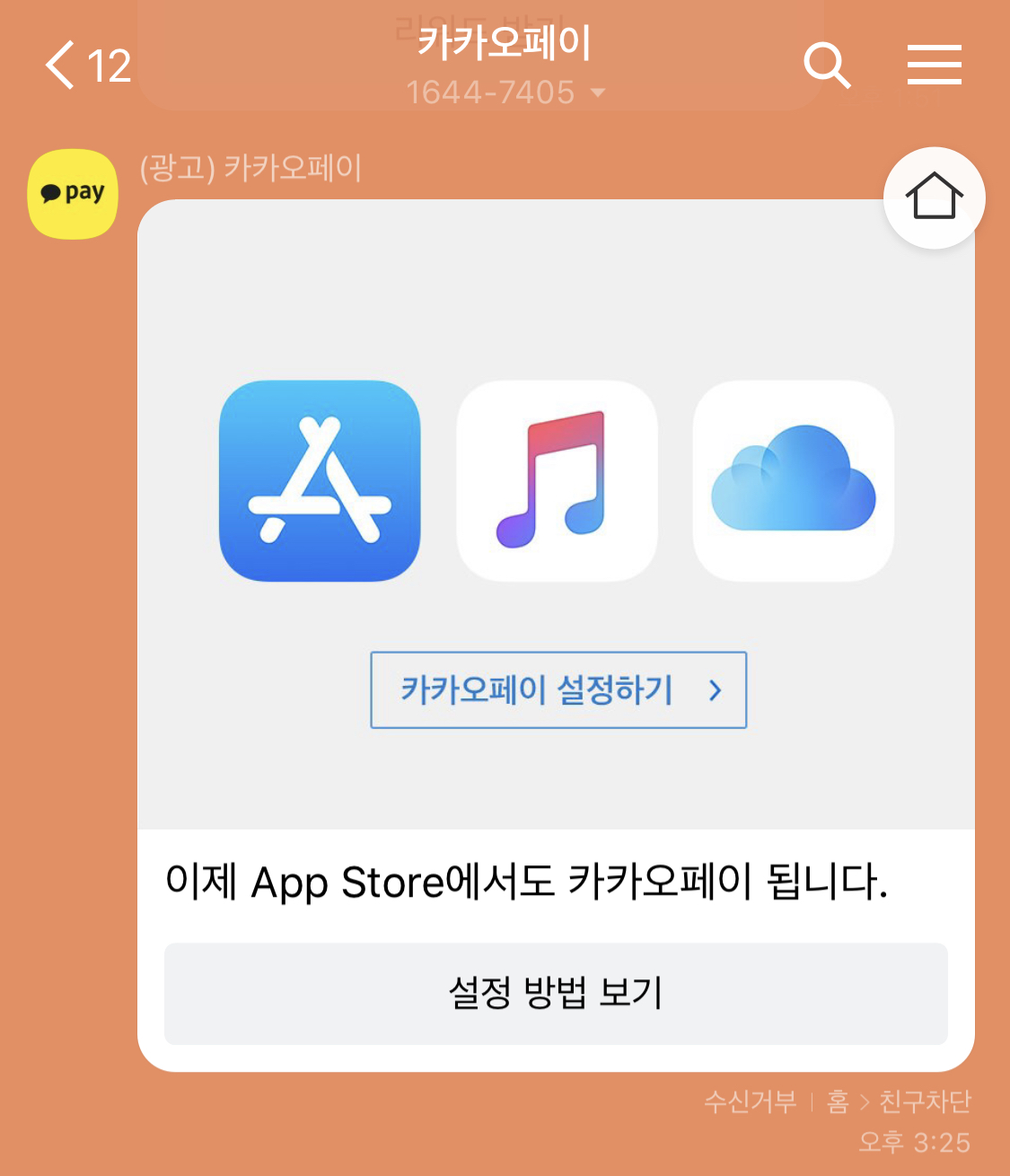 굉장히 흥미로운 메시지가 도착했습니다. 애플 앱스토어에서 카카오페이가 지원된다는 소식입니다. 바로 설정해보았습니다.