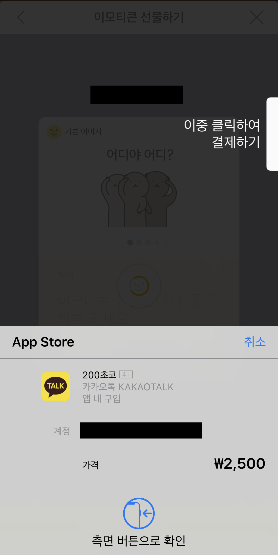 실제로 결제를 하면 어떻게 될지 궁금하여 테스트 결제를 해보았습니다. 이것 때문에 여자친구한테 괜히 카톡 이모티콘 하나 선물해줬네요.