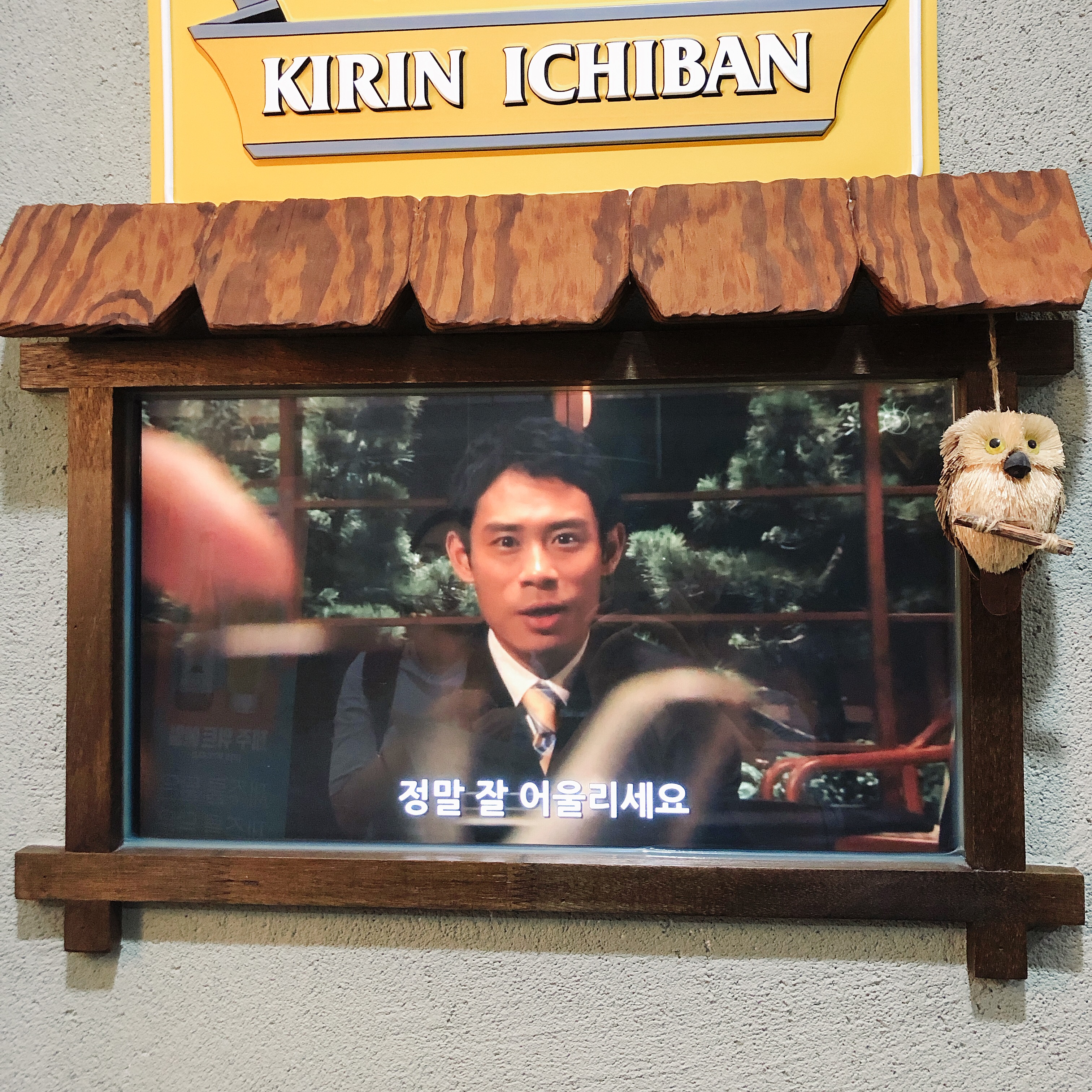 밖에는 이렇게 일본 드라마인 '이상적인 스키야키'가 나오고 있습니다. 센스 넘치는 가게 운영입니다.