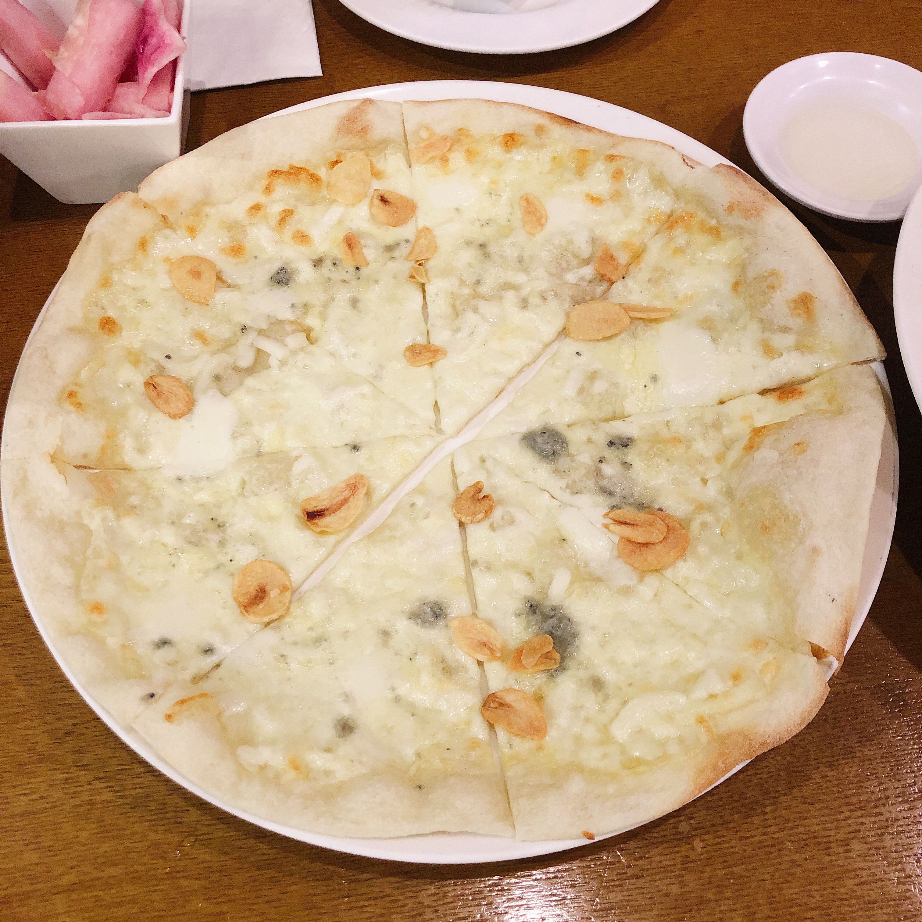 사실 음식의 맛은 그냥 그렇습니다. 무난한 수준입니다. 고르곤졸라 피자는 상상하는 그대로의 가벼운 치즈맛과 가벼운 도우의 그 느낌입니다. 꿀을 반드시 찍어먹도록 합시다. 마늘 후레이크가 몇조각 올라가 있긴 하네요.