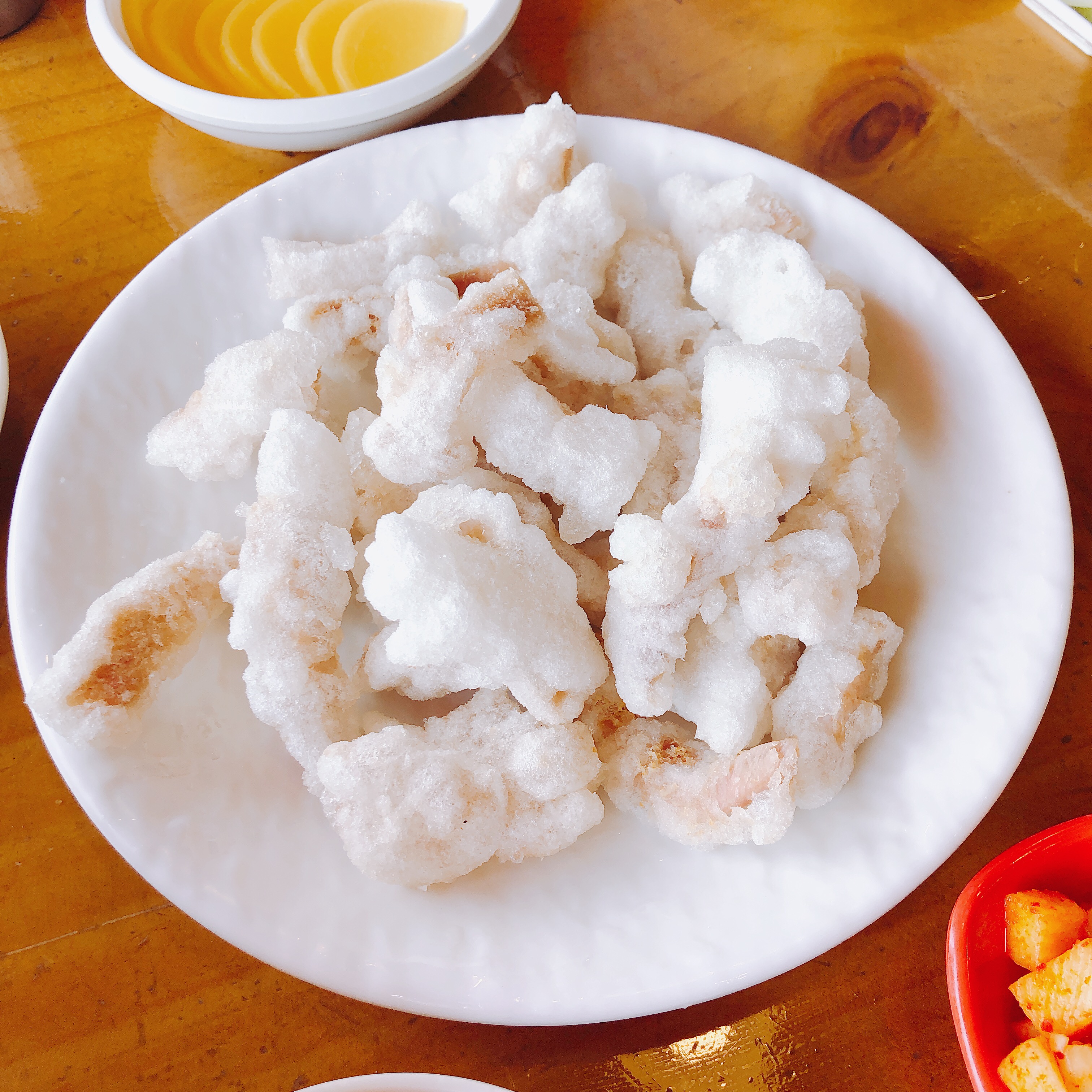 기본적으로 찍먹모드로 나옵니다. 그리고 하얀 튀김옷 인데요. 찹쌀 탕수육은 아닙니다. 100% 감자 전분 이라고 합니다.