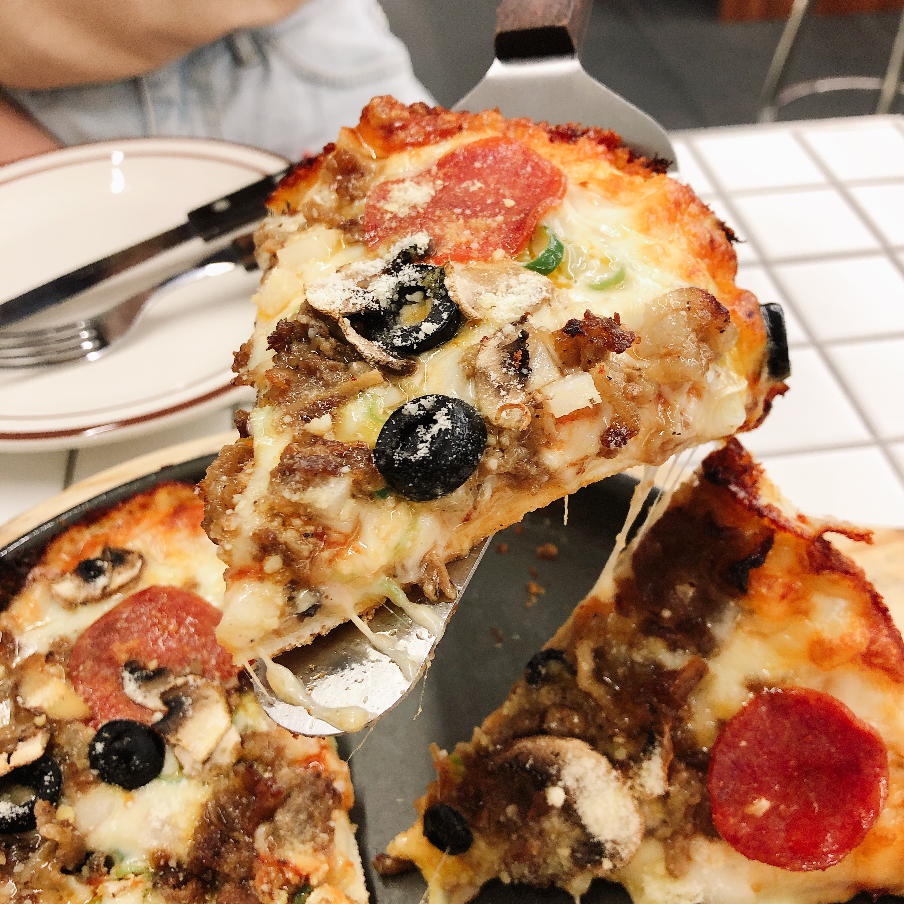 피자는 크기가 작은대신 두툼합니다. 물론 시카고 피자만큼 두툼하진 않습니다.