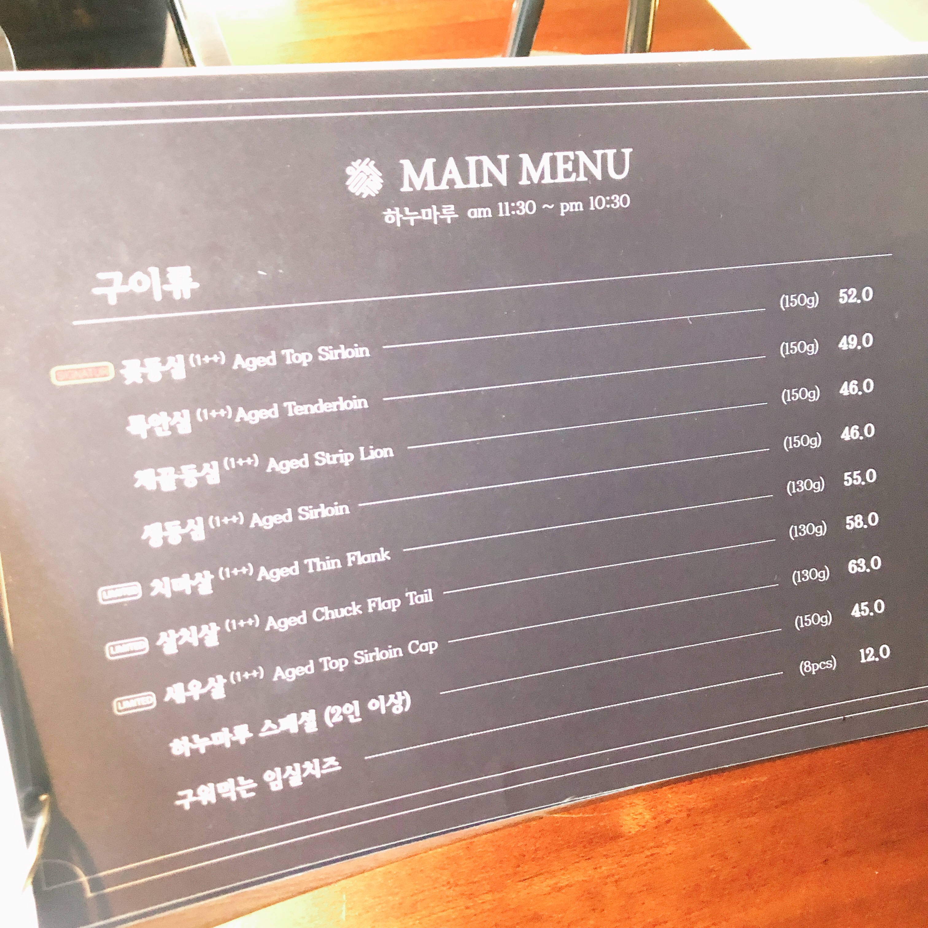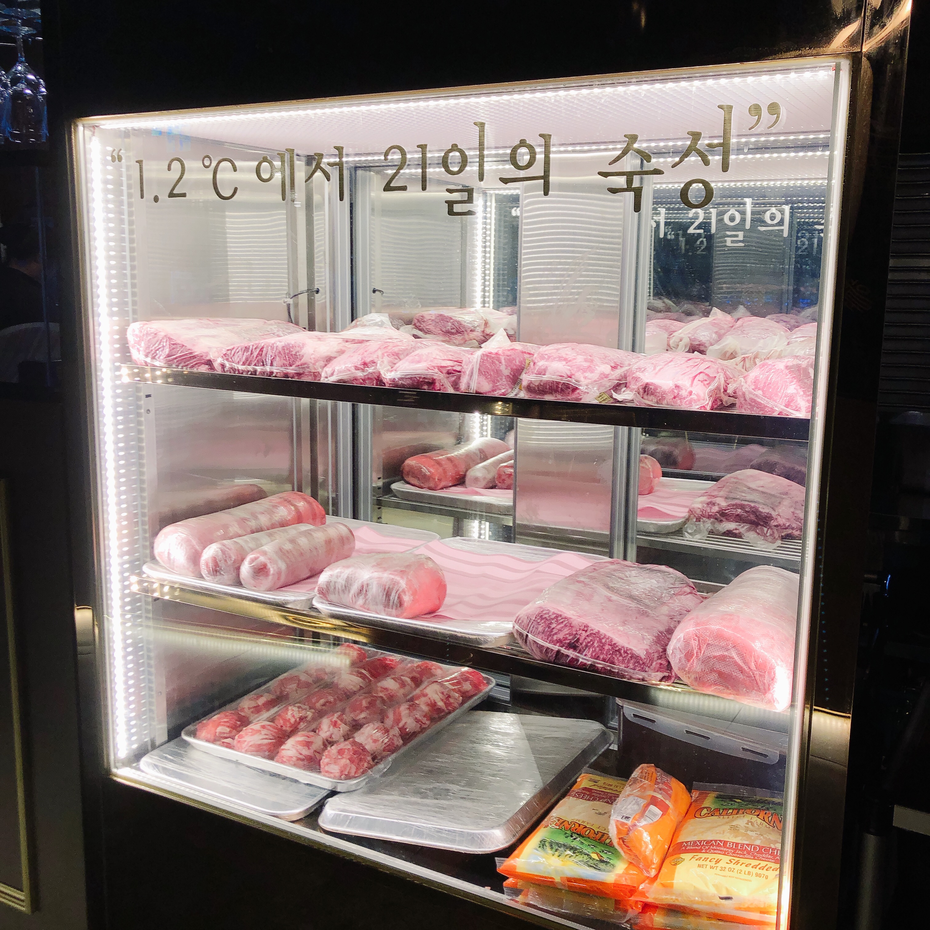 숙성중인 한우가 전시되어 있는데요. 사실 이 고기들은 극히 일부일것 같습니다. 주방 안에 더 많은 것들이 준비되어 있겠죠?
