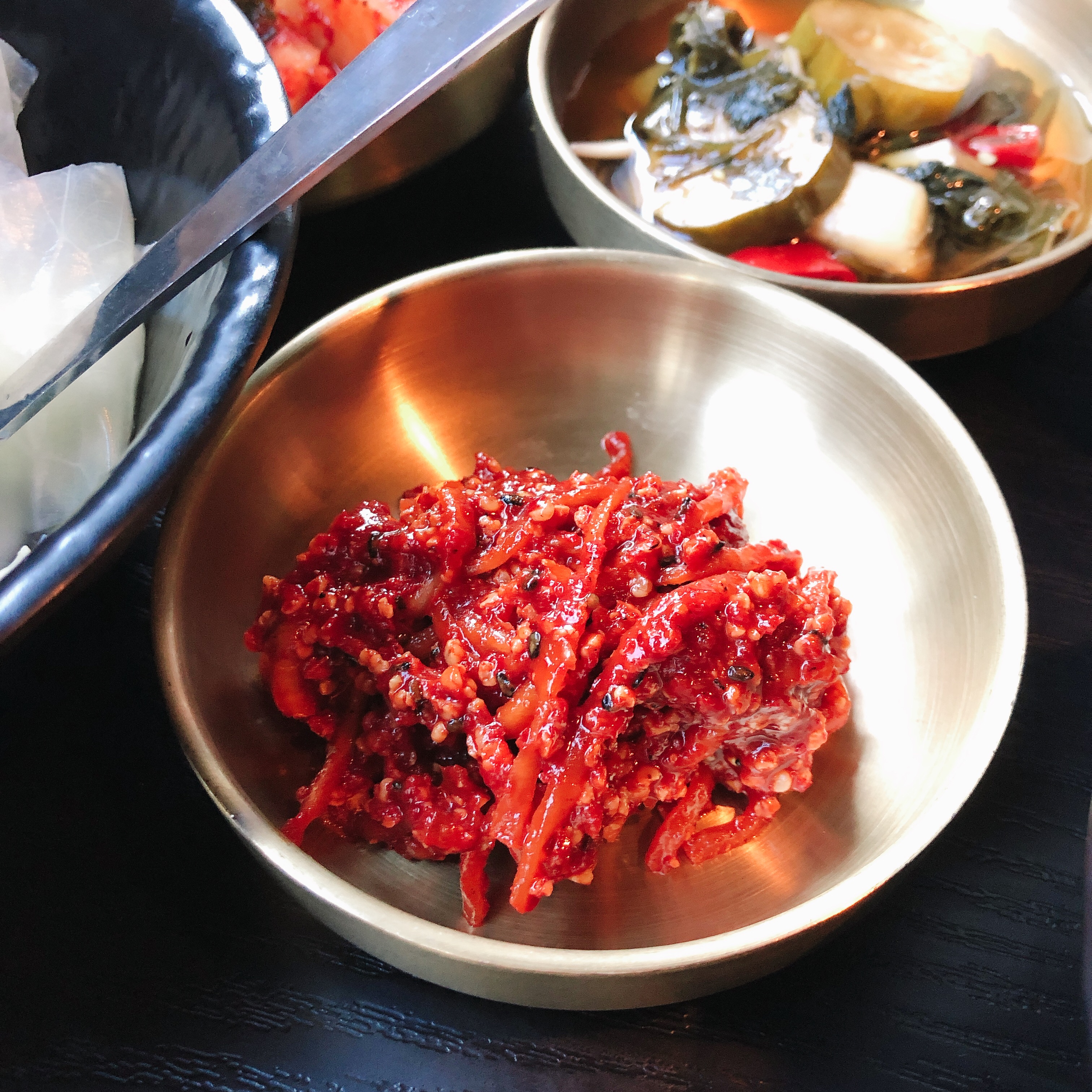 오징어 식해(식혜 아님) 입니다. 이 녀석도 굉장히 맛있는 찬 인데요. 쉽게 먹을 수 없는 음식이기도 합니다만, 그래서 맛있는게 아니라 정말 그냥 객관적으로 봐도 맛있습니다. 이미 찬들 구성만으로도 10점 만점의 10점이라해도 과언이 아닙니다.