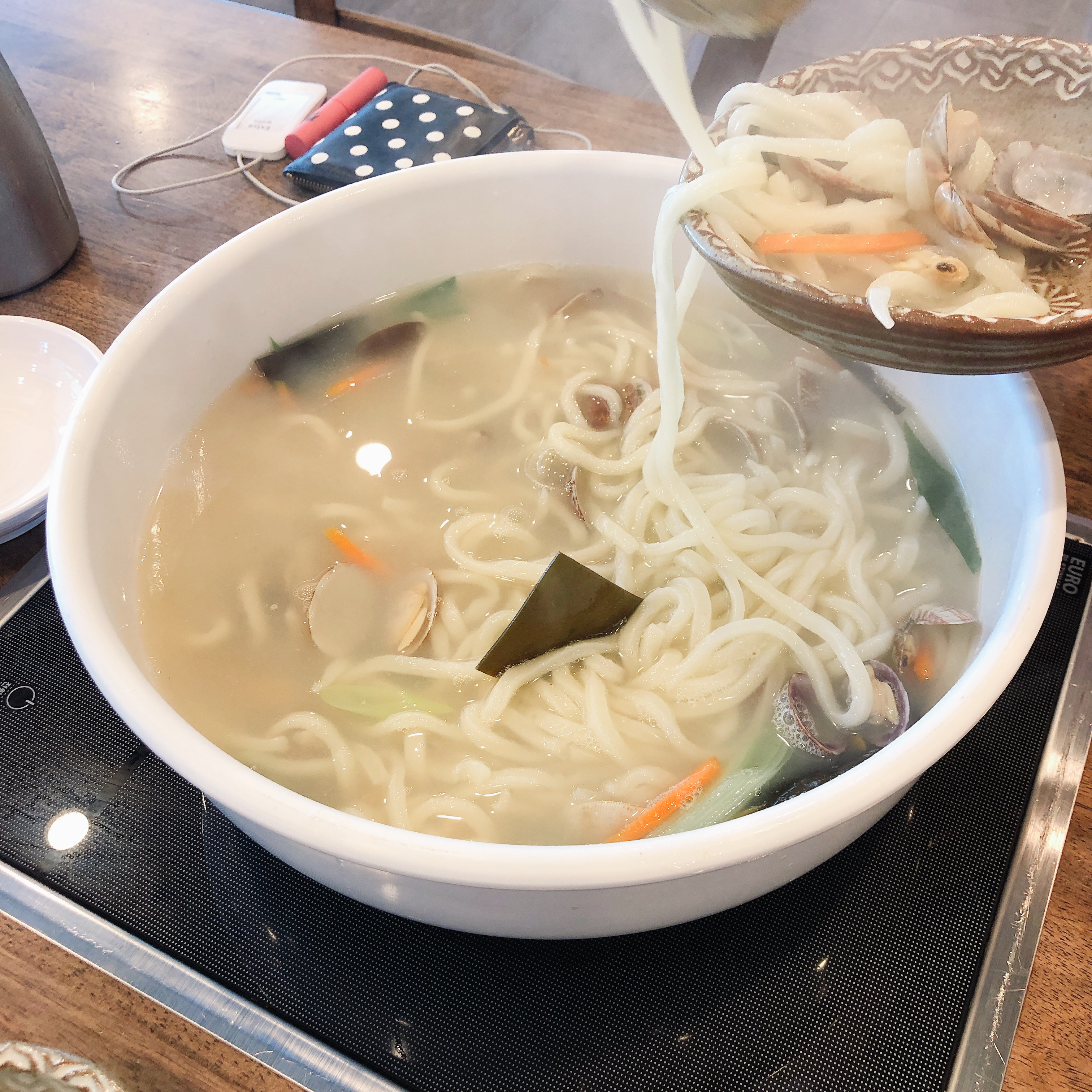 먹는 도중에 사진을 찍었는데요. 바지락이 매우 많이 들어있습니다. 바지락의 크기도 적당히 큼지막 해서 만족스럽습니다. 바지락의 상태도 매우 훌륭합니다.