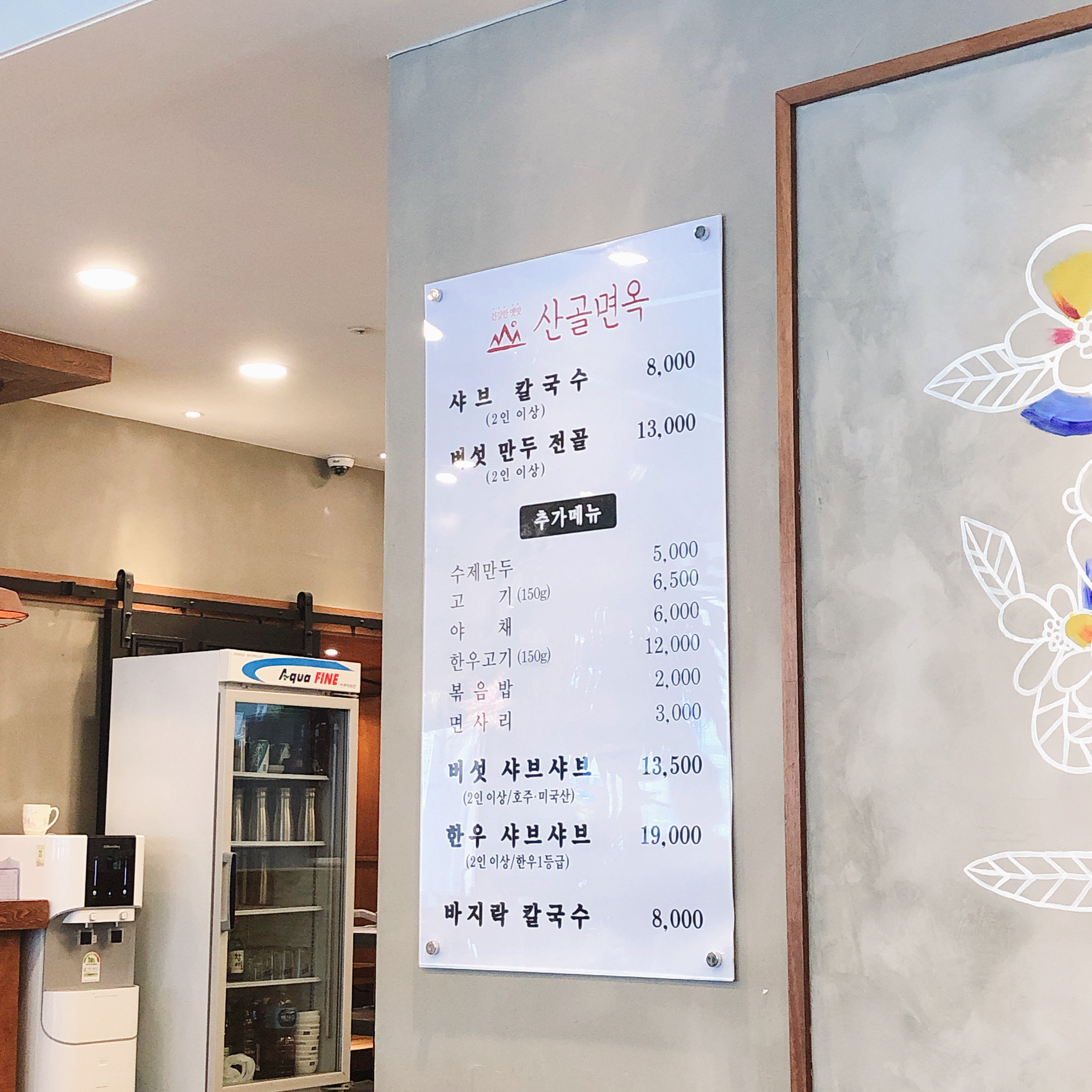 메뉴판입니다. 샤브 칼국수가 맨 위에 있는 걸 보니 시그니처 메뉴인듯 합니다만, 저희 일행의 경우 맨 아래에 있는 바지락 칼국수를 주문하였습니다.