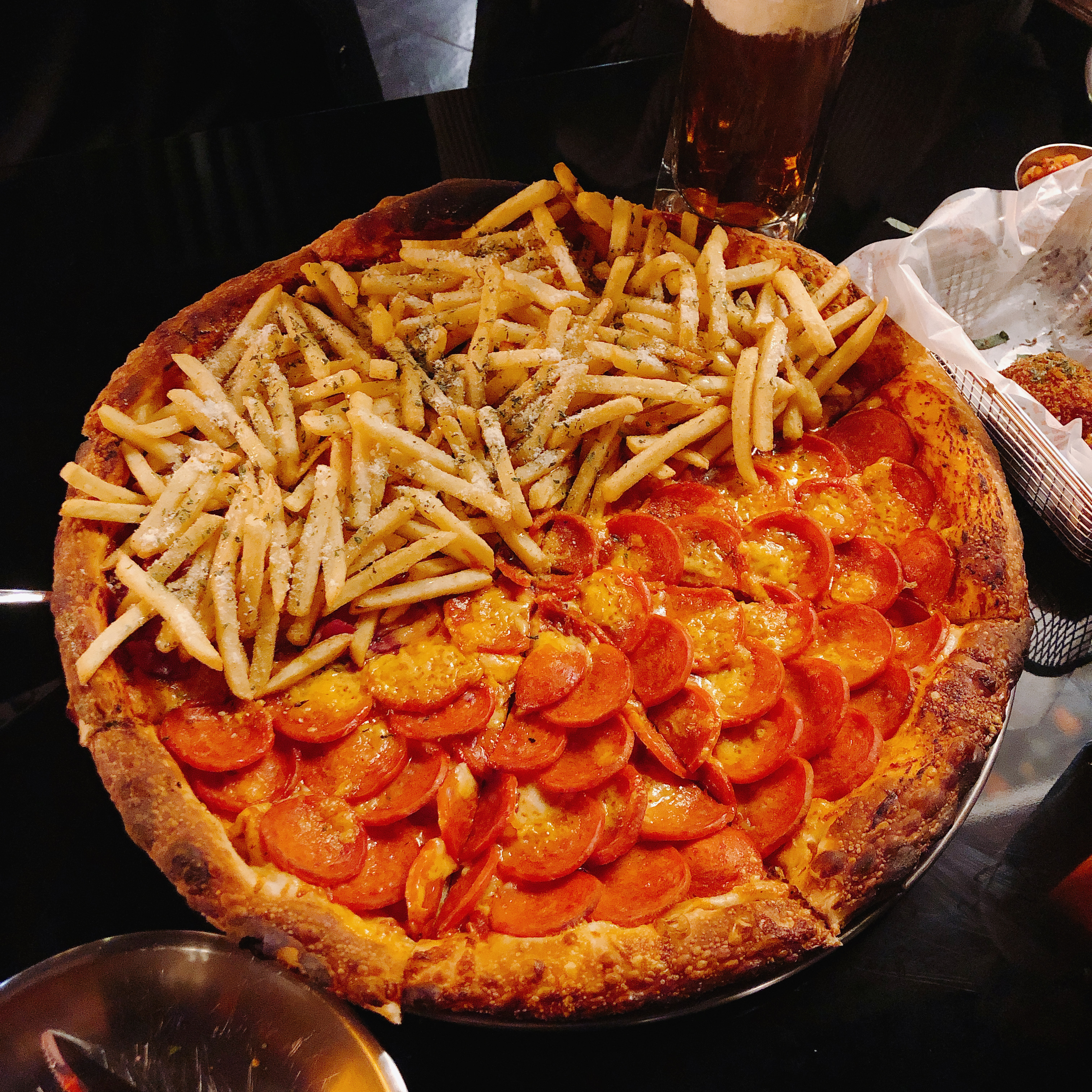 엄청난 비주얼 보이시나요? 위가 포테이토피자, 아래가 페퍼로니 피자입니다. 프렌치프라이를 따로 시켜서 위에 부은것 같은 비주얼입니다. 피자인데 치즈가 거의 안보입니다. 따라서 호불호가 좀 있을 순 있겠으나, 엄청난 토핑이 기분을 좋게 합니다.