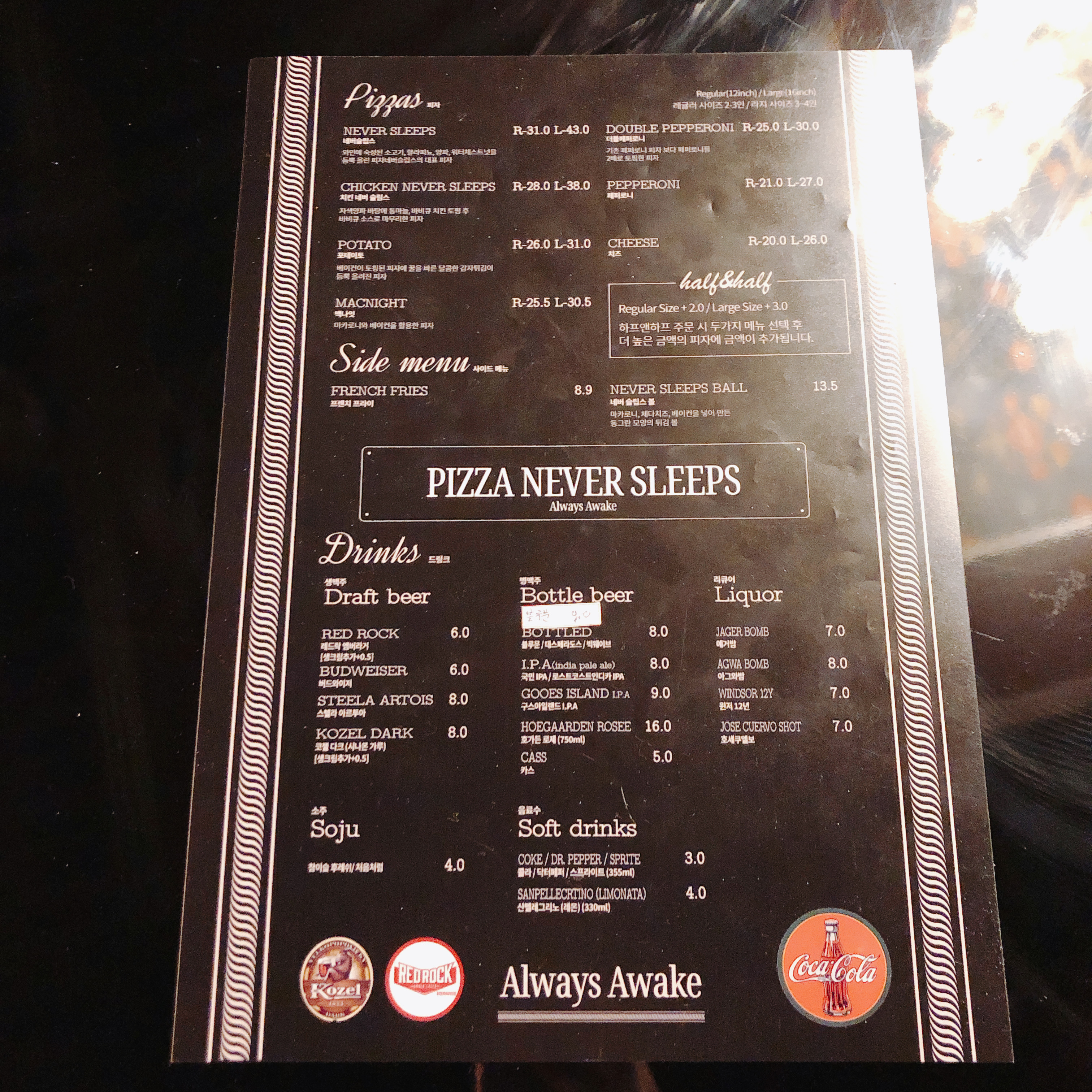 여기서 인상깊었던 피자집을 찾았는데요. 바로 Pizza never sleeps (피자네버슬립스) 입니다. 굳이 번역하자면 '피자는 잠들지 않는다' 정도 겠죠?