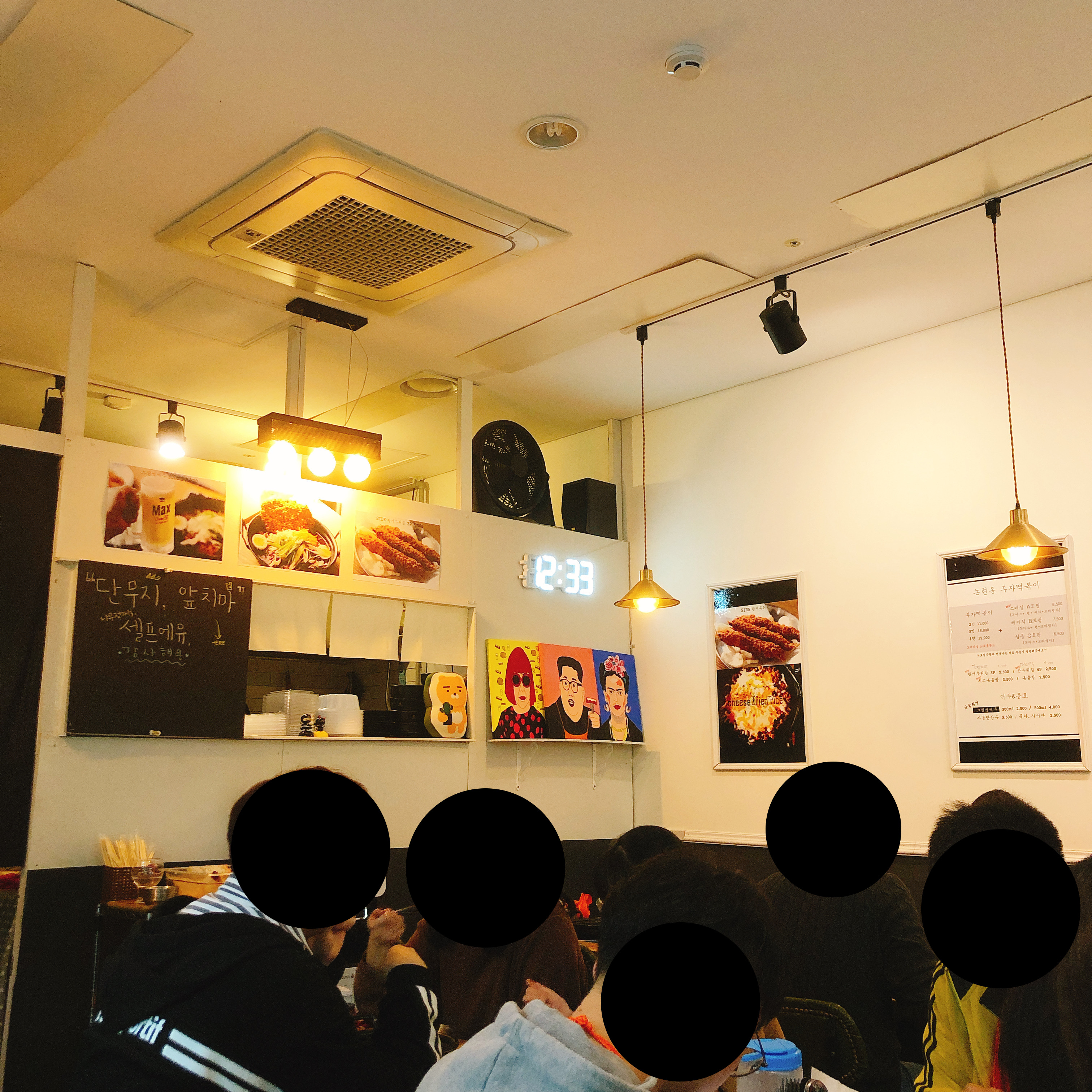 매장이 좀 작습니다. 그래서 좀 타이트하게 앉을 필요도 있습니다. 그리고 저기 시계밑에 그림이 있는데요. 김정은이 있어서 깜짝 놀랐네요.