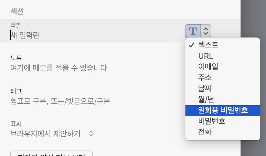 mac의 경우 상단의 "1Password 검색" 이라 쓰여있는 텍스트박스 오른쪽의 + 버튼을 눌러 진행합니다.