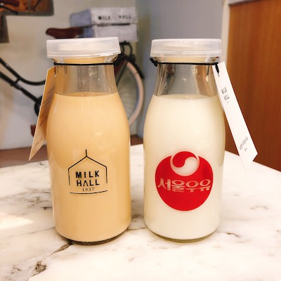 왼쪽은 밀크티이고 오른쪽은 그냥 우유입니다. 오른쪽 레트로한 유리병이 너무 맘에들어서 사봤습니다.