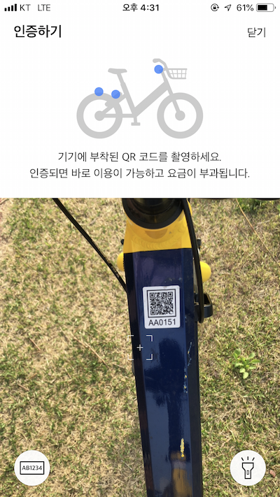 자전거를 찾았으면 바로 앱을 통해 QR코드를 스캔하면 되겠습니다.