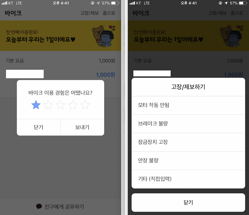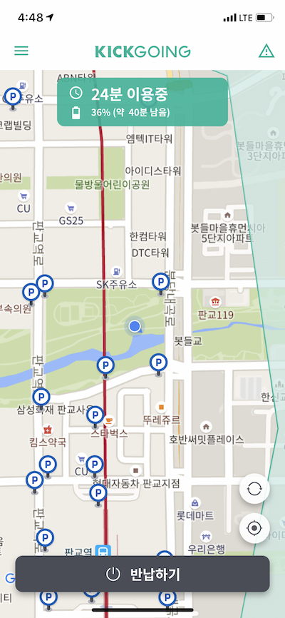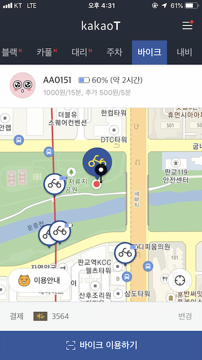 그래서 저도 오늘 서비스를 이용해보았는데요. 판교 테크노벨리에 널부러져있는 자전거와 킥보드를 타보았습니다.