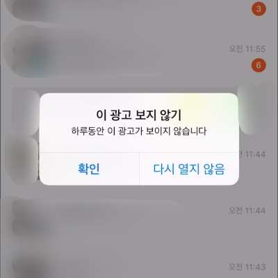 스와이프 후 "숨김"버튼을 누르면 위와 같은 팝업이 등장합니다. 저의경우 여기서 "다시 열지 않음"을 선택했더니 위 시연에서 팝업이 나오지 않았습니다. 참고로 저 광고 영역 자체를 영구적으로 없애는 방법은 없습니다. 켬/끔 기능도 없죠. 단, 하루동안 안나오게 할 수는 있습니다. 참고로 여기서 숨긴다는 의미는 저 광고 영역을 하루동안 숨기는것이 아닌 저 광고 소재를 하루동안 숨긴다는 의미입니다.