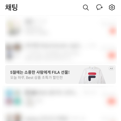채팅방 중간에 배너가 끼여있긴 합니다만 제 개인적으로는 사용성을 해치는 수준은 아닌것 같습니다. 컬러톤도 자극적이지 않습니다.
