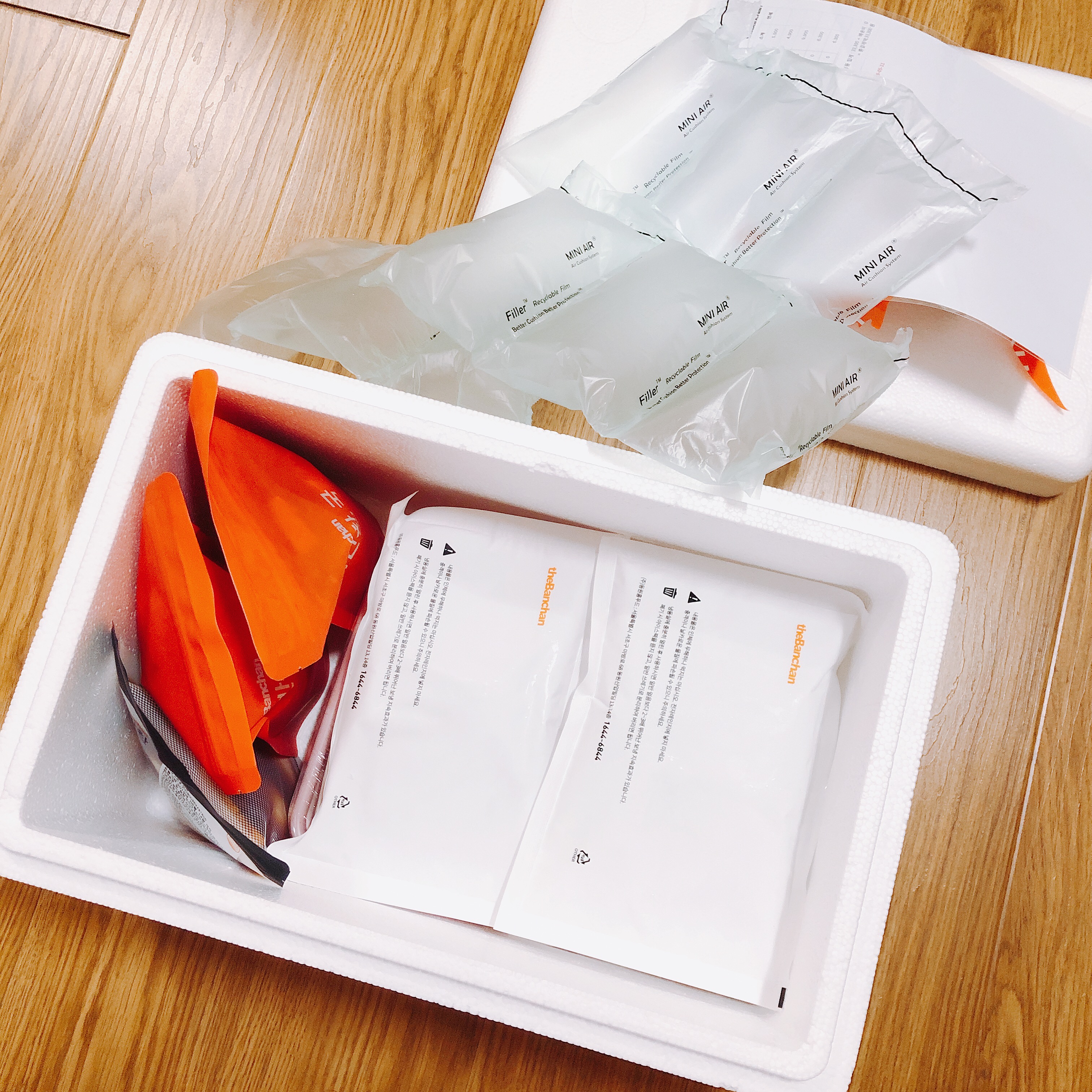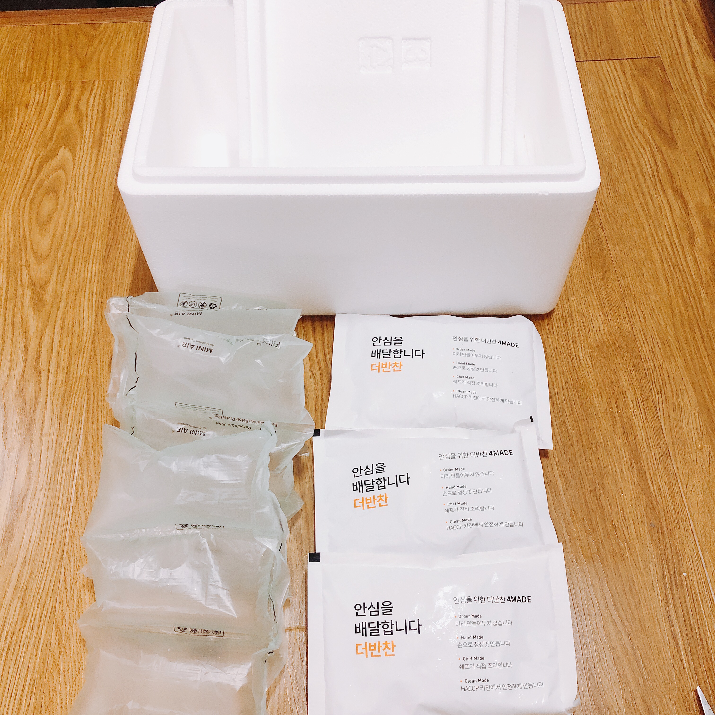 반찬은 이런식으로 포장되어 옵니다. 개인적으로 이 점이 더반찬의 가장 아쉬운 부분인데요. 마켓컬리의 경우 종이박스로 배송되고 아이스팩은 다음 구매시 수거해가는 옵션이 있습니다. 하지만 더반찬의 경우 스티로폼 박스로 배송이 오고 수거옵션은 없습니다. 간편식품 서비스 이용자가 환경파괴의 주범자가 된것 같아 사실 맘이 편하지 않습니다. 나중에라도 꼭 자원을 수거해가는 시스템이 생겼으면 좋겠습니다. 어서 이를 대체할 솔루션들이 개발되어 신선식품 서비스 이용자들이 죄책감을 느끼지 않았으면 좋겠습니다.