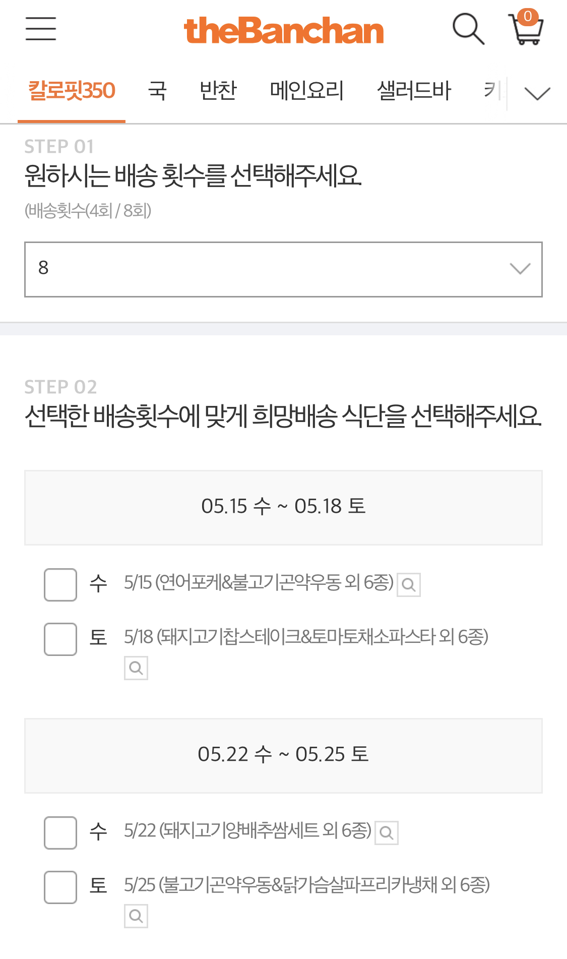 음식 종류별로만 나눠진게 아니라 7데이세트, 정기식단, 칼로핏350, 키즈 등 상황에 따라 분리한 카테고리는 굉장히 유용합니다.