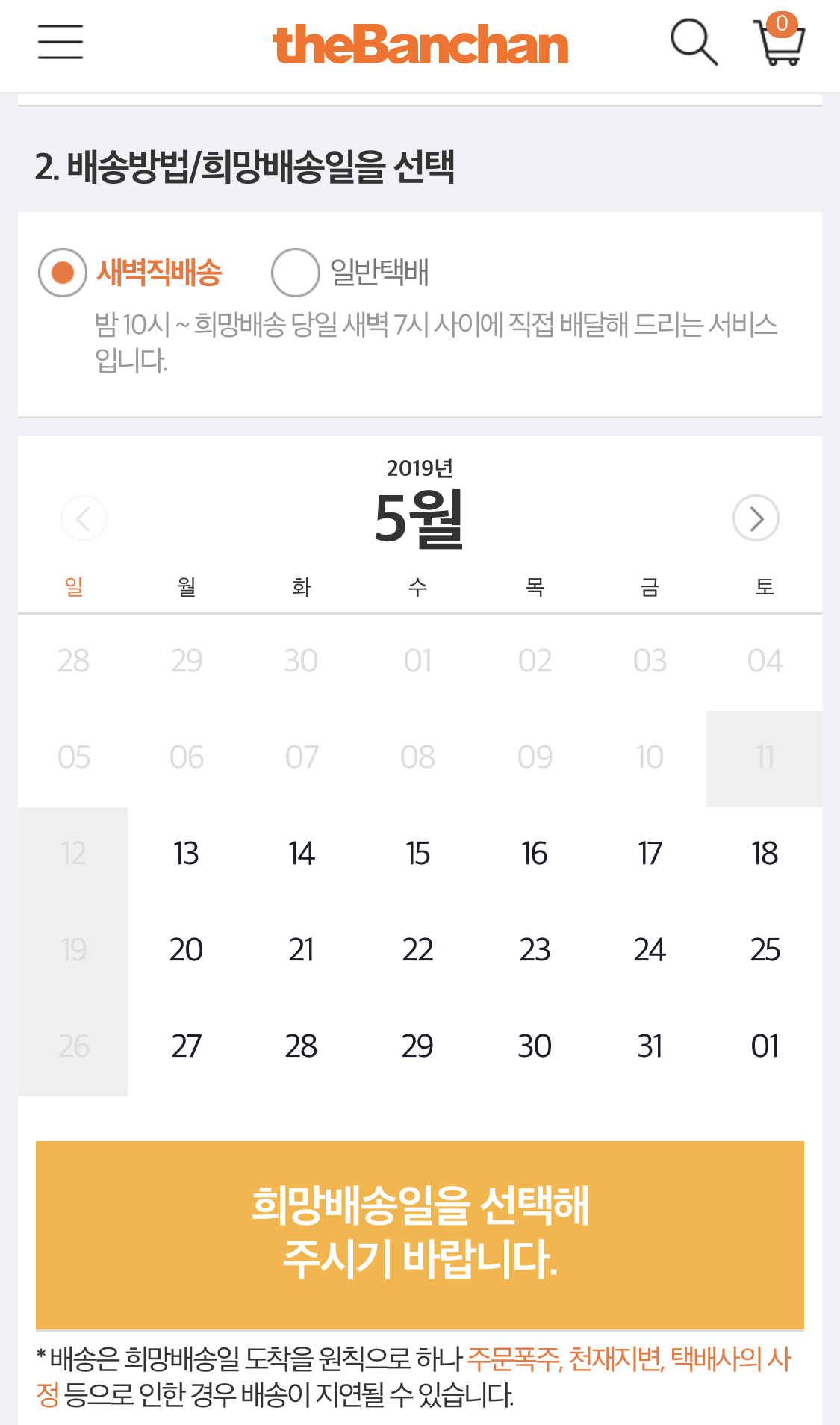 새벽직배송의 경우 이렇게 날짜 선택이 가능합니다. 마켓컬리의 경우는 바로 내일 아침도 선택 가능한데 더반찬의 경우는 그정도까진 안됩니다. 그래도 이틀 뒤 정도면 훌륭합니다. 저의 경우 주말에 먹을 것들을 목요일 밤에 장을 보고 토요일 새벽에 받습니다. (집돌이의 의지)