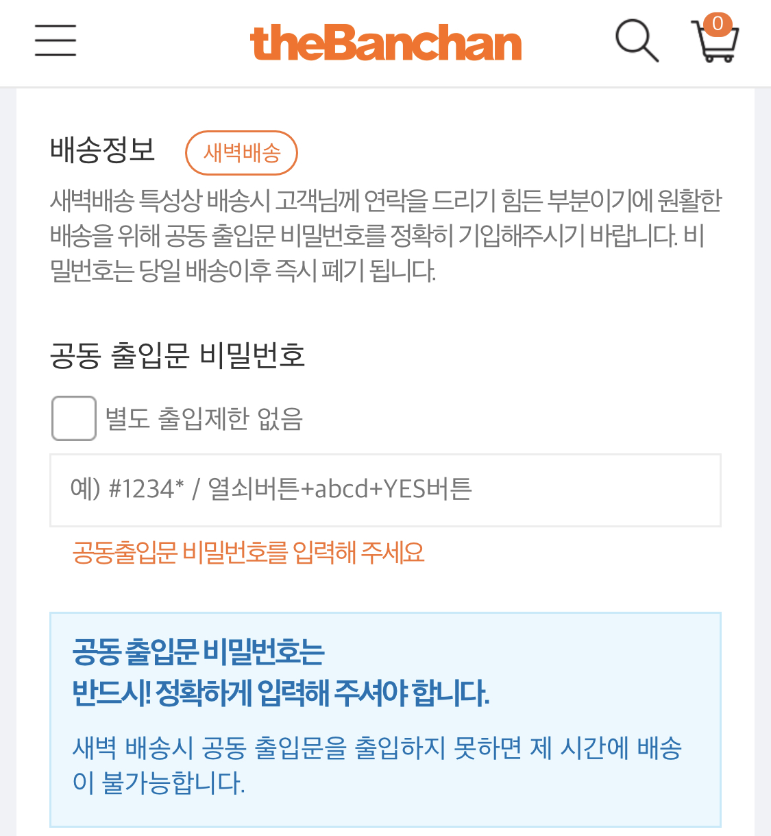 이게 굉장히 중요한 포인트인데요. 공동 출입문 비밀번호를 입력하지 않으면 배송에 어려움이 있습니다. 아쉬운건 저 공동 출입문 비밀번호를 주문시마다 매번 입력해야한다는 점 입니다. 저장이 되도록 필드를 한개 팠으면 어떨까 싶습니다. 정신 안차리면 잊어버릴 수 있으니 주의해야합니다. 따라서 저 영역을 디자인적으로 좀 더 강조했으면 어떨까 싶습니다. (지금도 강조되어있지만 더더더 강조 했으면 어떨까 싶어요.)