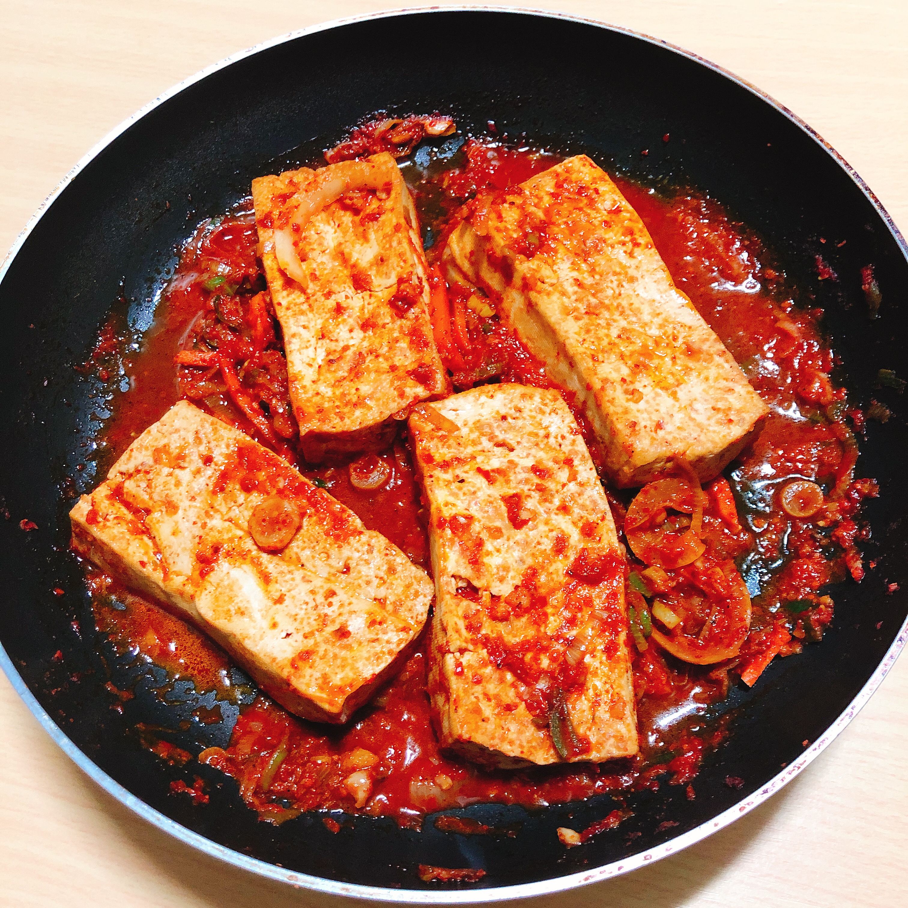 제가 사진을 참 맛없게 찍었네요. 두부조림은 저 두부가 총 6조각 들어있습니다. (두 조각 꺼내먹음) 상상하는 그 맛있게 매콤한 바로 그 두부조림 맛입니다. 흰 밥 위에 올려 먹으면 정말 맛있습니다.