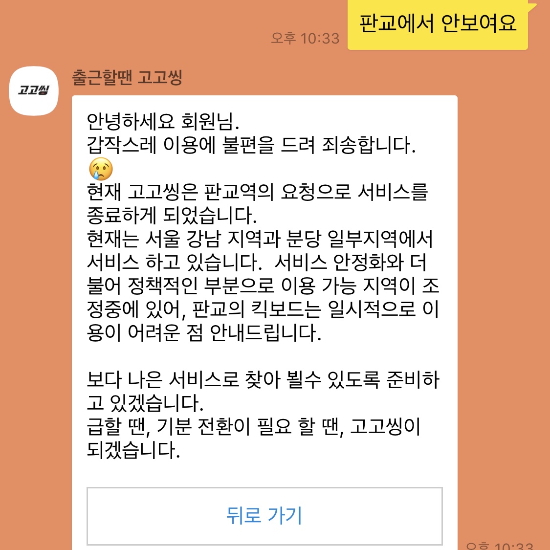 위에 언급한것 처럼 개인적으로 관심있던 서비스였는데요. 판교에서 서비스가 종료되어 무척 아쉽습니다. 하지만 "킥고잉"은 계속 서비스 중이니 앞으로 그거라도 사용해야겠습니다.