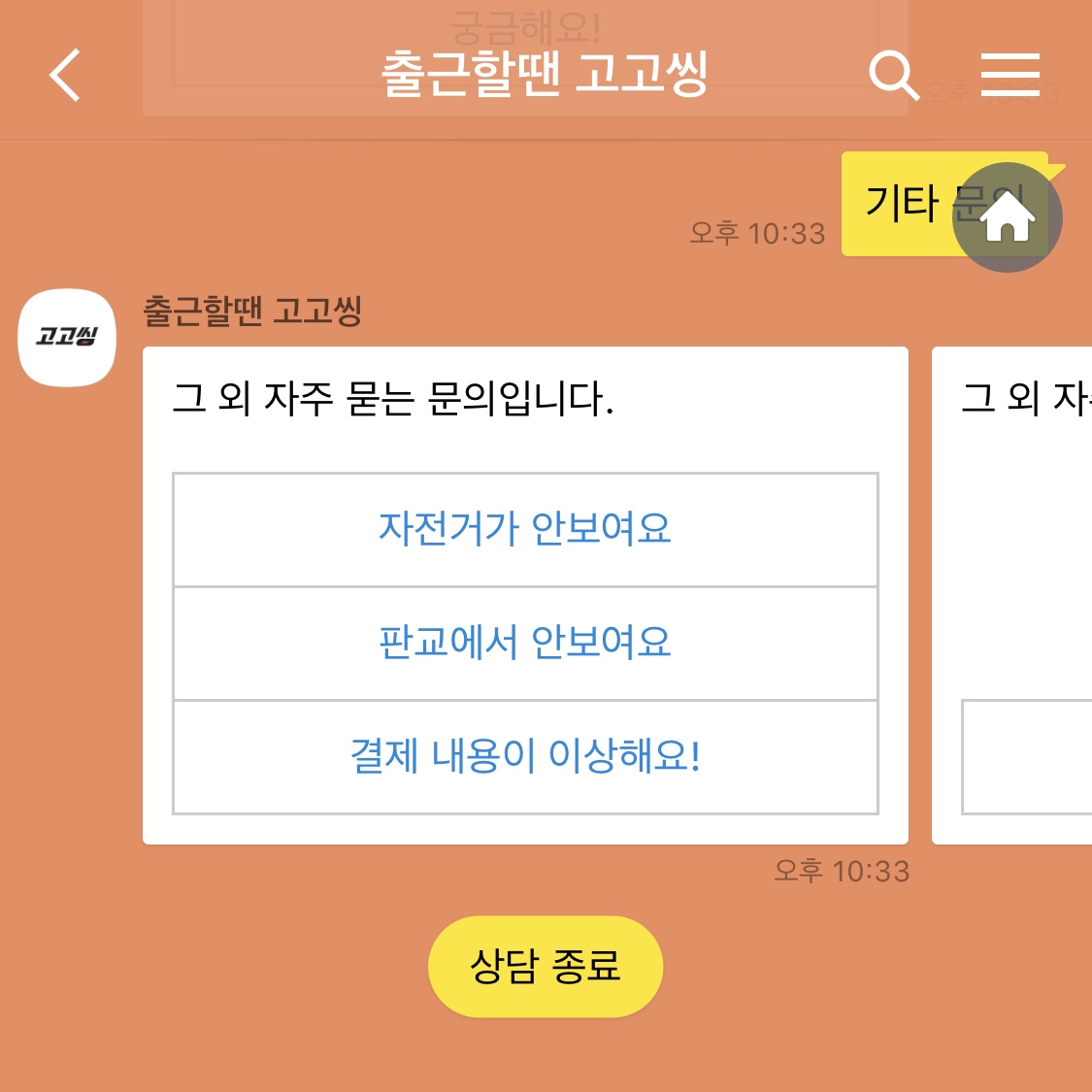 상담톡으로 연락을 취해보기로 했습니다. 사실 밤 늦은 시간이었기 때문에 상담원과 톡을 할 수 있을거란 기대는 하지 않았습니다. 그런데 위 처럼 "판교에서 안보여요"라는 FAQ 항목이 있었습니다. 뭔가 부득이한 사정이 있는 것이 틀림 없다는 직감이 들었습니다.