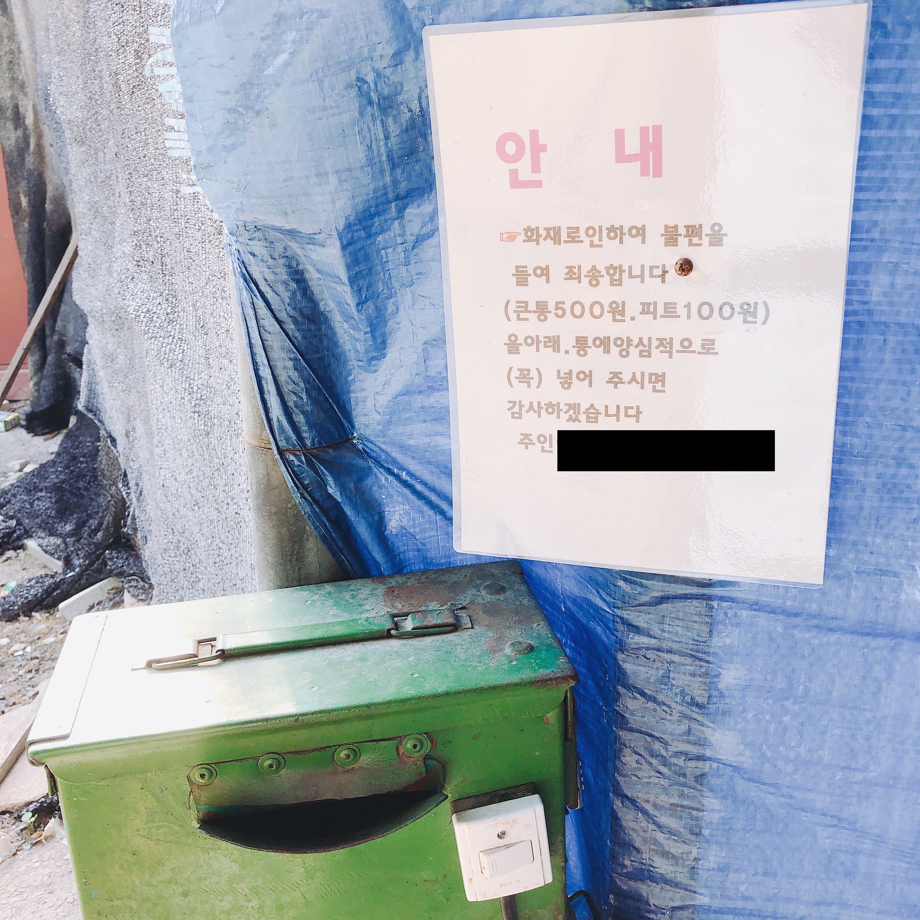 특이한 점은, 저 주위에 아무도 없습니다. 양심적으로 돈을 넣고 가야합니다. 제가 아주 어렸을 때 부터 항상 저랬습니다. 참고로 말씀드리자면 저 돈은 물 값은 아니고요. 물을 퍼 올리는 데 쓰이는 펌프 가동의 전기세로 쓰입니다. (역시 아버지 발 뇌피셜)