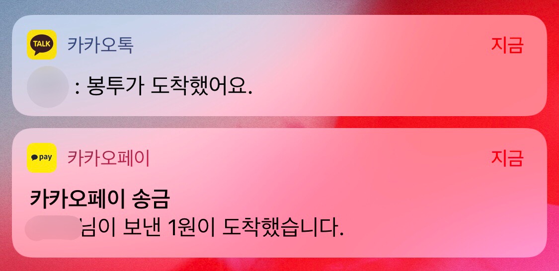 그리고 페이머니를 송금 받은 경우 위처럼 카카오톡에서 한 번, 카카오페이 앱에서 또 한 번 푸시가 옵니다. 물론 카카오페이 앱의 푸시를 끄면 되겠습니다만 카카오톡의 알림을 받지 않고 싶을 때의 선택지가 없다는 점은 아쉽습니다.