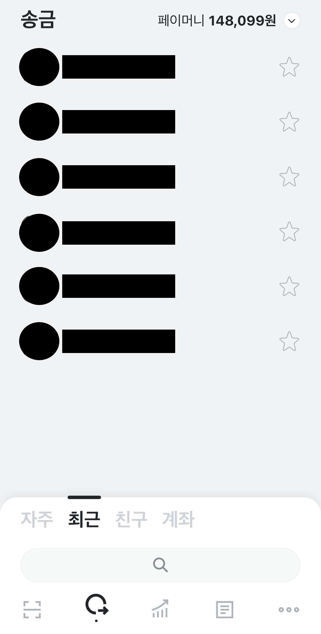 두번째 탭에서는 송금을 할 수 있습니다. 카톡 친구 목록을 볼 수 있고, 위처럼 최근에 송금했던 친구 목록을 따로 볼 수 있으며 즐겨찾기 등록도 가능합니다. "계좌"에서는 계좌번호 송금도 가능합니다. 아무래도 카톡에서 더보기를 눌러 카카오페이를 찾아 위의 액션을 하는 것 보다 별도 앱에서 간편하게 처리하는게 더 빠를 것 같습니다.