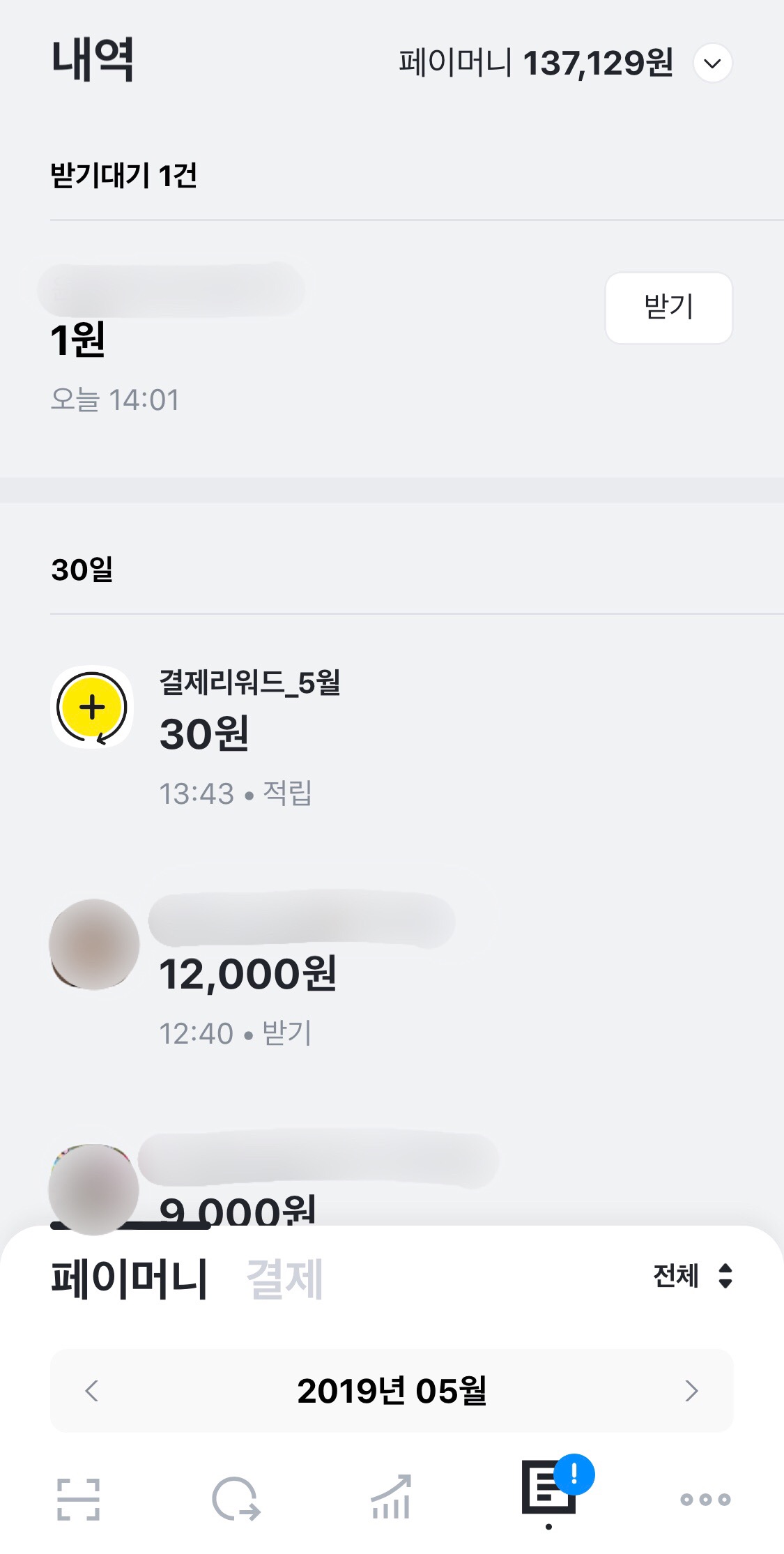 네번째 탭에서는 페이머니를 주고 받은 내역과 결제내역이 나타나며 송금된 페이머니를 받을 수도 있습니다. 월별로 필터링 할 수 있기 때문에 나중에 확인하기는 용이할 것 같습니다. 저 금액을 줬는지 받았는지 여부는 금액 아래에 작은 태그로 표현이 됩니다. 송금, 받기, 적립, 결제 등의 태그가 있는것 같습니다. 참고로 카카오페이 체크카드를 발급받아 사용하는 경우 이 영역에 "결제" 태그가 붙습니다.