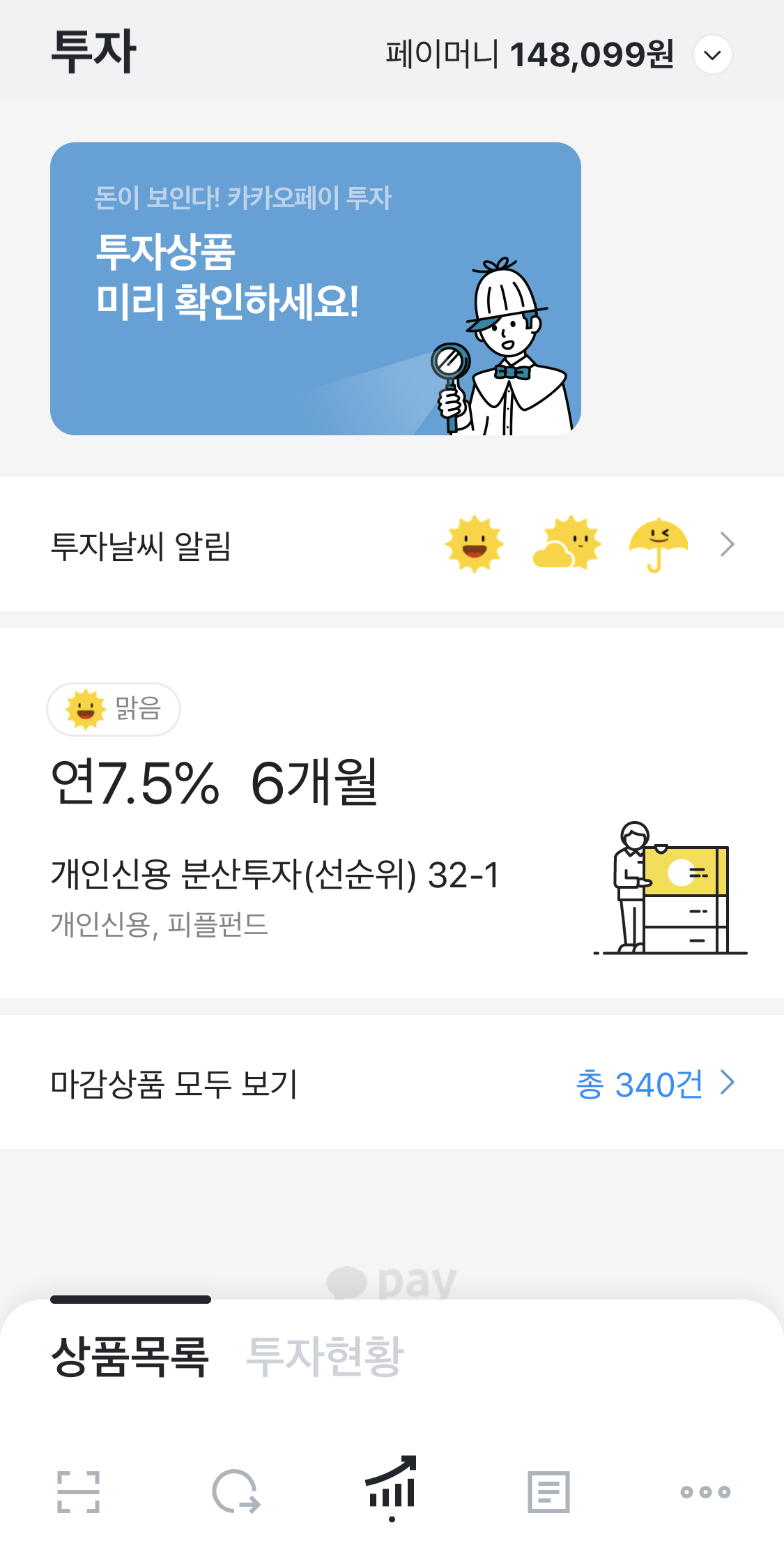 세번째 탭은 투자 정보가 나옵니다. 최근에 카카오페이에서 투자할 수 있는 상품들이 나오고 있는데요. 물론 전 아직 이용할 생각이 없습니다만 카카오페이에선 이를 전면에 내세우고 있습니다.