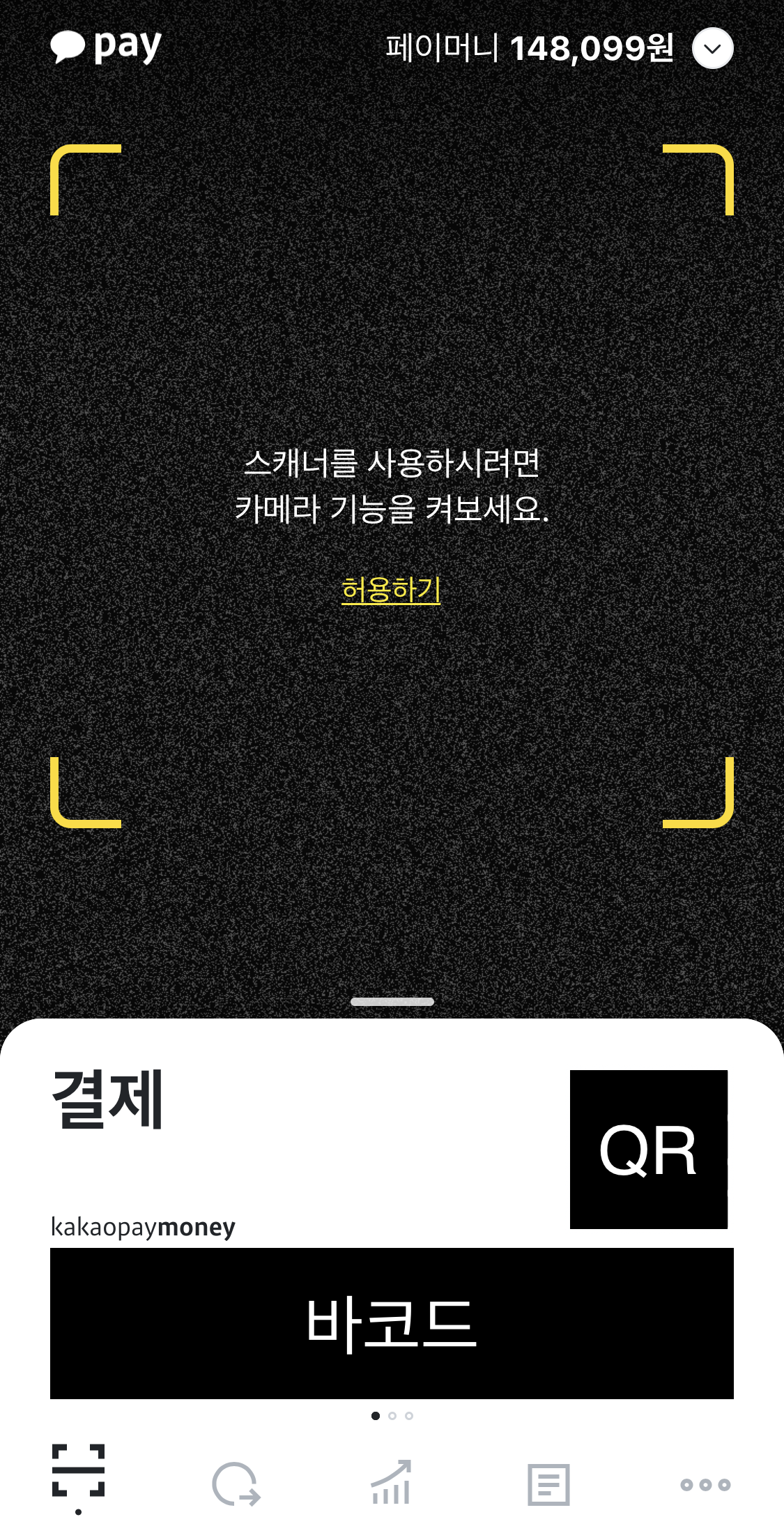 앱의 메인화면입니다. "허용하기"를 누르면 앞으로 저 부분에 카메라 영역이 나타나게 됩니다. 애초에 오프라인 결제에 최적화 된 동선으로 개발되었습니다. 아무래도 오프라인 결제 시 카톡을 켜고 더보기에 들어가서 카카오페이를 선택하는 것 보단 이렇게 바로 앱을 띄우는 것이 간단하고 빠르겠죠.