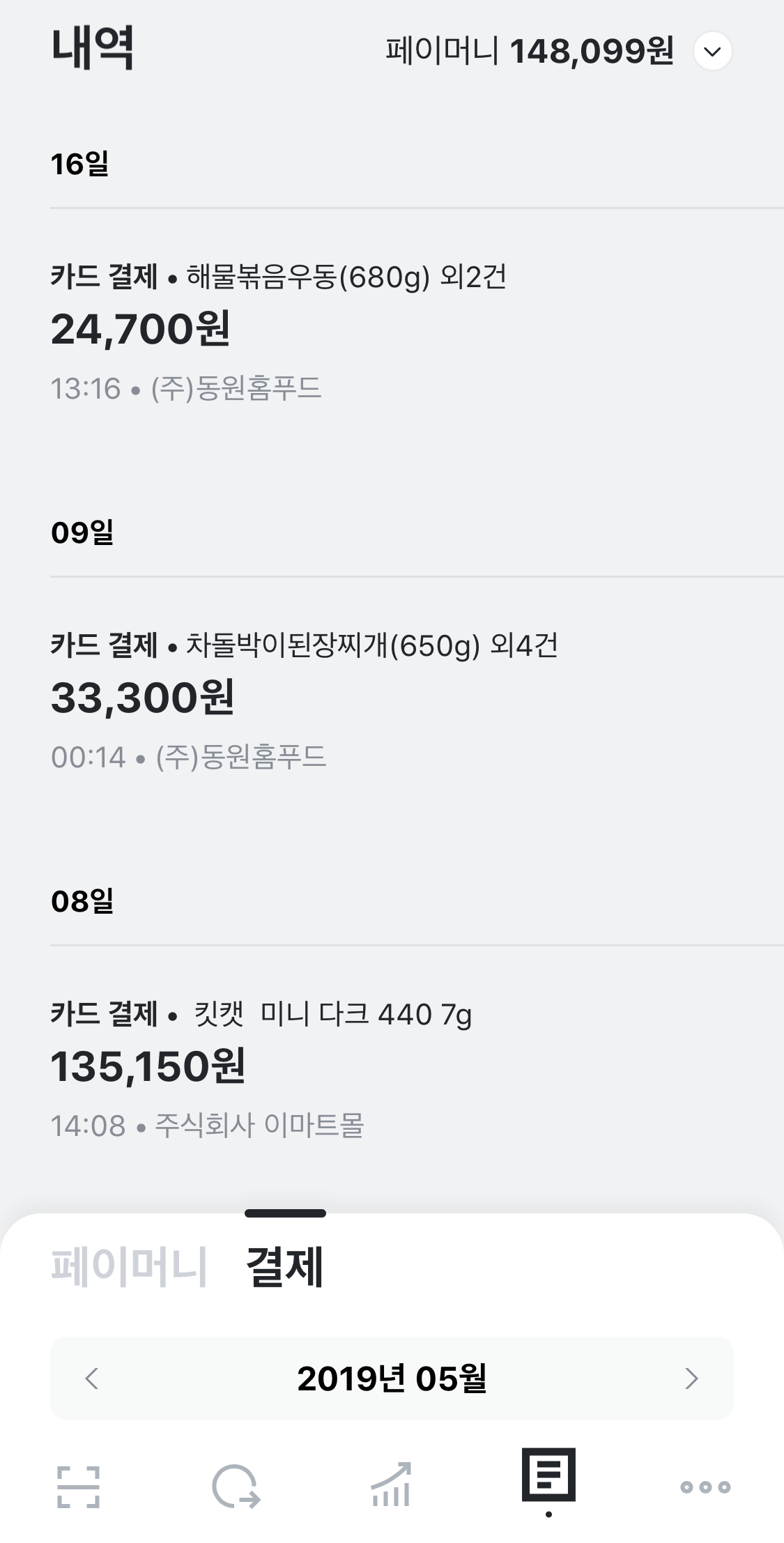 이 부분은 좀 더 확인이 필요합니다만 왠지 카카오페이로 연결된 카드 결제 내역만 나오는 것 같습니다. 뭘 저렇게 많이 처먹은건지.