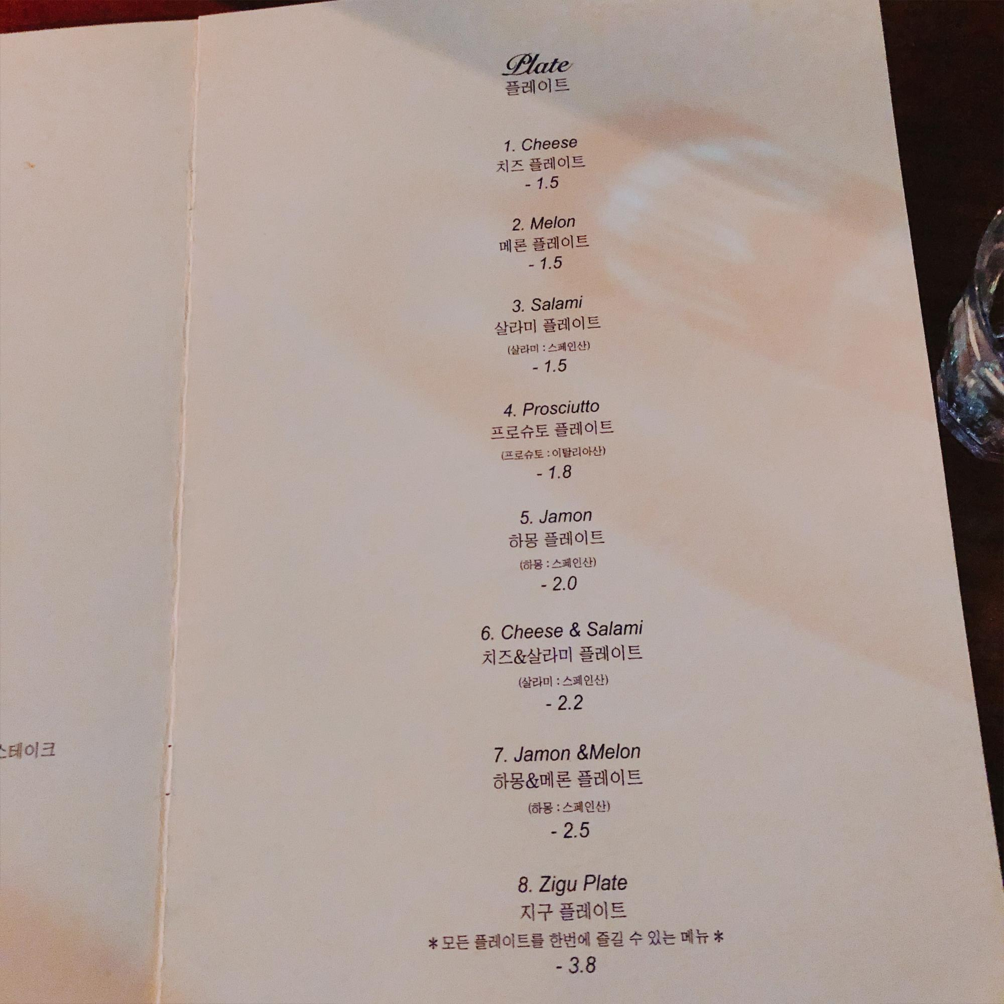안타깝게도 사진이 매우 엉망입니다. 위는 "지구 플레이트"라는 메뉴인데요. 각종, 치즈, 하몽과 메론을 비롯한 과일 등 와인 한 잔을 곁들이기에 좋은 구성으로 나옵니다.