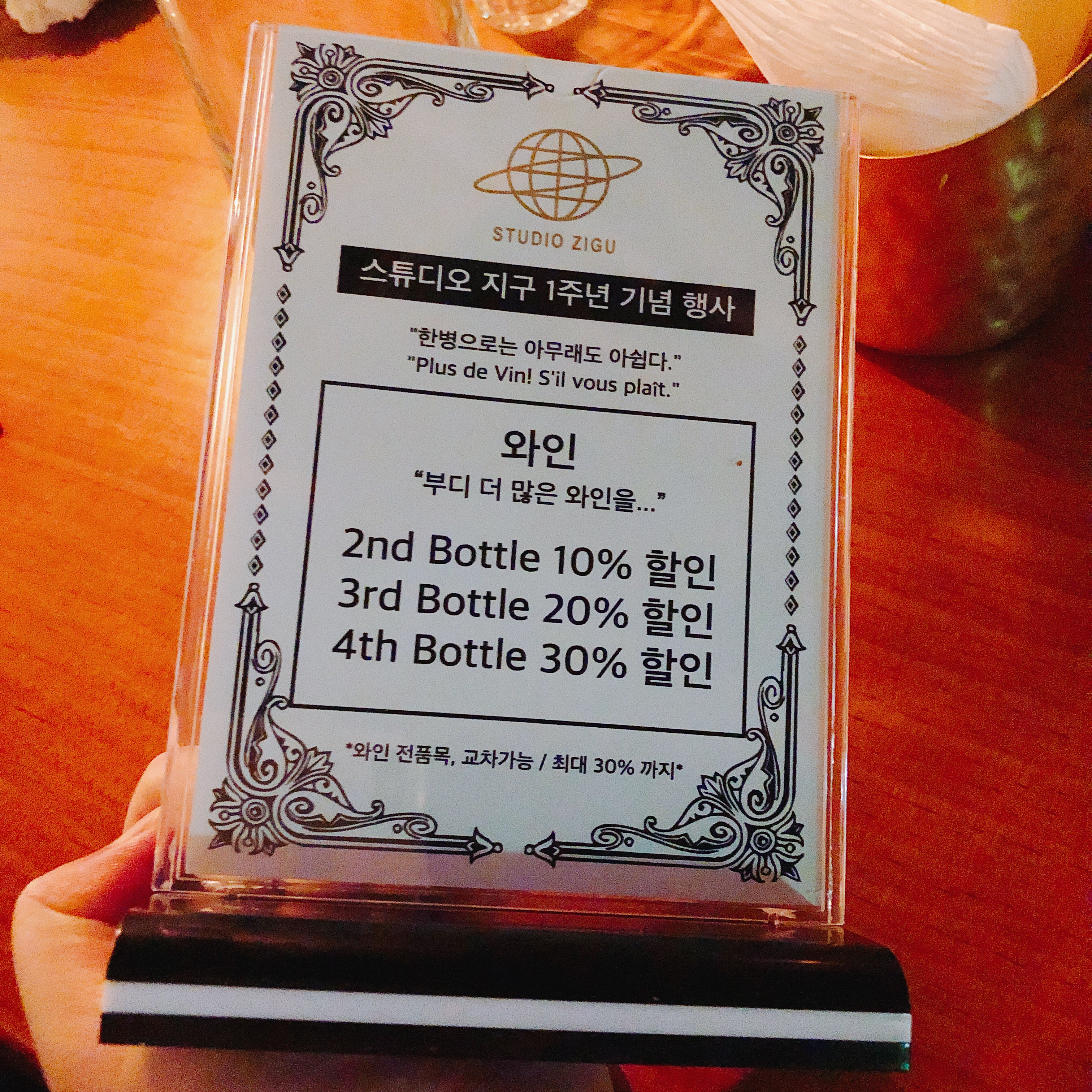 근데 이게 참.. 사장님께서 와인을 시킬 때 마다 점점 더 맛있는 와인을 추천해주시다보니 홀짝홀짝 너무 많이 마시게 되었습니다. 와인으로 각 1병을 마신 것 같습니다.