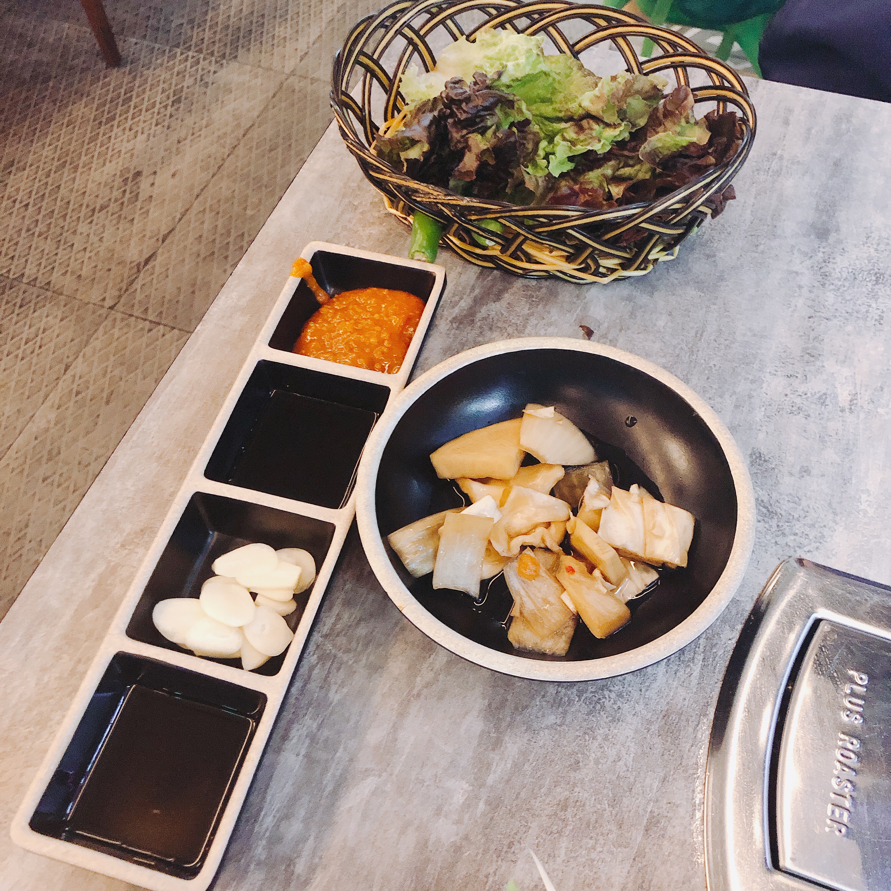 기름장, 마늘, 쌈장, 쌈채소 등이 나옵니다.